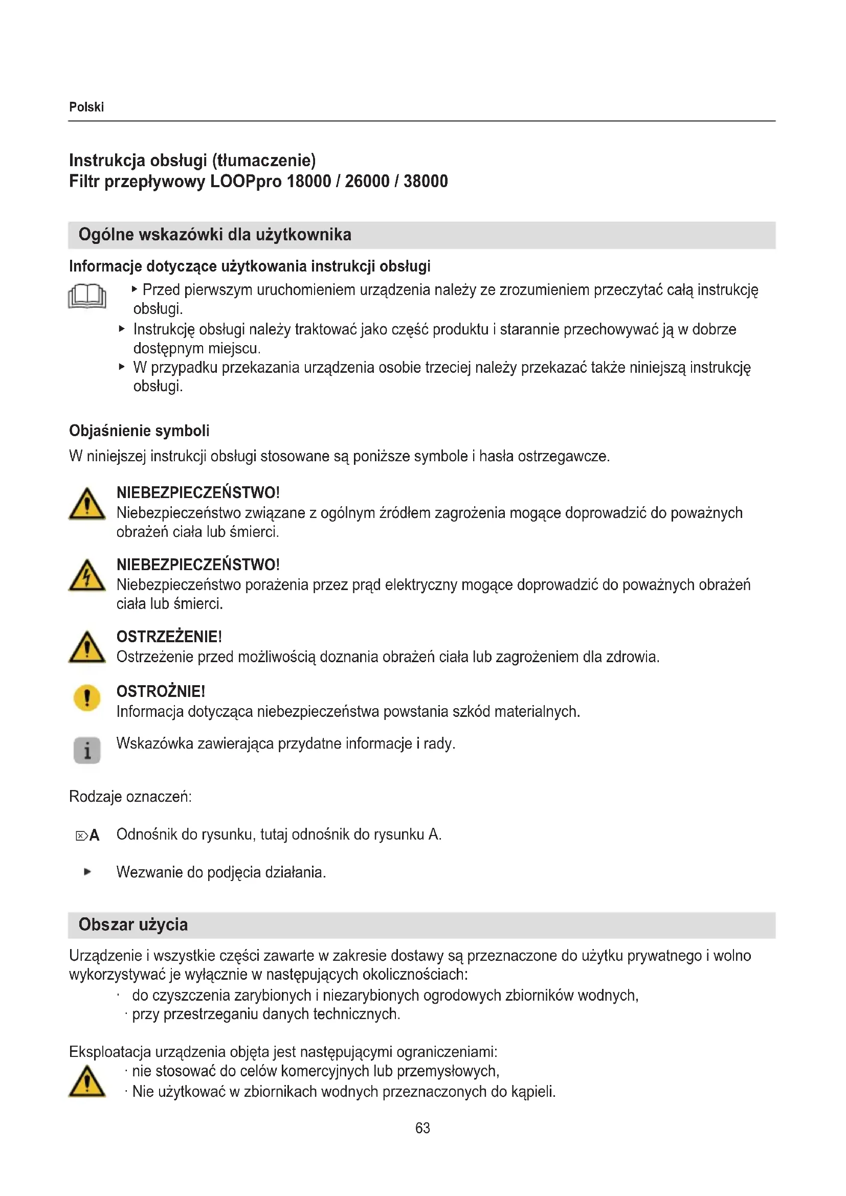 sına teslim edin. Yedek parçalar Bkz. sayfa 3.63 Polski Instrukcja obsługi (tłumaczenie) Filtr przepływowy LOOPpro 18000 / 26000 / 38000 Obszar użycia Urządzenie i wszystkie części zawarte w zakresie dostawy są przeznaczone do użytku prywatnego i wolno wykorzystywać je wyłącznie w następujących okolicznościach: ‧ do czyszczenia zarybionych i niezarybionych ogrodowych zbiorników wodnych, ‧ przy przestrzeganiu danych technicznych. Eksploatacja urządzenia objęta jest następującymi ograniczeniami: ‧ nie stosować do celów komercyjnych lub przemysłowych, ‧ Nie użytkować w zbiornikach wodnych przeznaczonych do kąpieli. Ogólne wskazówki dla użytkownika Informacje dotyczące użytkowania instrukcji obsługi ▶ Przed pierwszym uruchomieniem urządzenia należy ze zrozumieniem przeczytać całą instrukcję obsługi. ▶ Instrukcję obsługi należy traktować jako część produktu i starannie przechowywać ją w dobrze dostępnym miejscu. ▶ W przypadku przekazania urządzenia osobie trzeciej należy przekazać także niniejszą instrukcję obsługi. Objaśnienie symboli W niniejszej instrukcji obsługi stosowane są poniższe symbole i hasła ostrzegawcze. NIEBEZPIECZEŃSTWO! Niebezpieczeństwo związane z ogólnym źródłem zagrożenia mogące doprowadzić do poważnych obrażeń ciała lub śmierci. NIEBEZPIECZEŃSTWO! Niebezpieczeństwo porażenia przez prąd elektryczny mogące doprowadzić do poważnych obrażeń ciała lub śmierci. OSTRZEŻENIE! Ostrzeżenie przed możliwością doznania obrażeń ciała lub zagrożeniem dla zdrowia. OSTROŻNIE! Informacja dotycząca niebezpieczeństwa powstania szkód materialnych. Wskazówka zawierająca przydatne informacje i rady. Rodzaje oznaczeń: Odnośnik do rysunku, tutaj odnośnik do rysunku A. Wezwanie do podjęcia działania. ⌦A64 Polski Bezpieczeństwo Niniejsze urządzenie może stanowić zagrożenie dla osób i rzeczy, jeśli będzie użytkowane nieprawidłowo lub niezgodnie z przeznaczeniem bądź jeśli wskazówki dotyczące bezpieczeństwa nie będą przestrzegane. Dla Twojego bezpieczeństwa ‧ Opakowanie urządzenia i drobne części nie mogą dostać się w ręce dzieci lub osób, które nie są świadome konsekwencji swoich działań (niebezpieczeństwo uduszenia!). Trzymać z dala od zwie