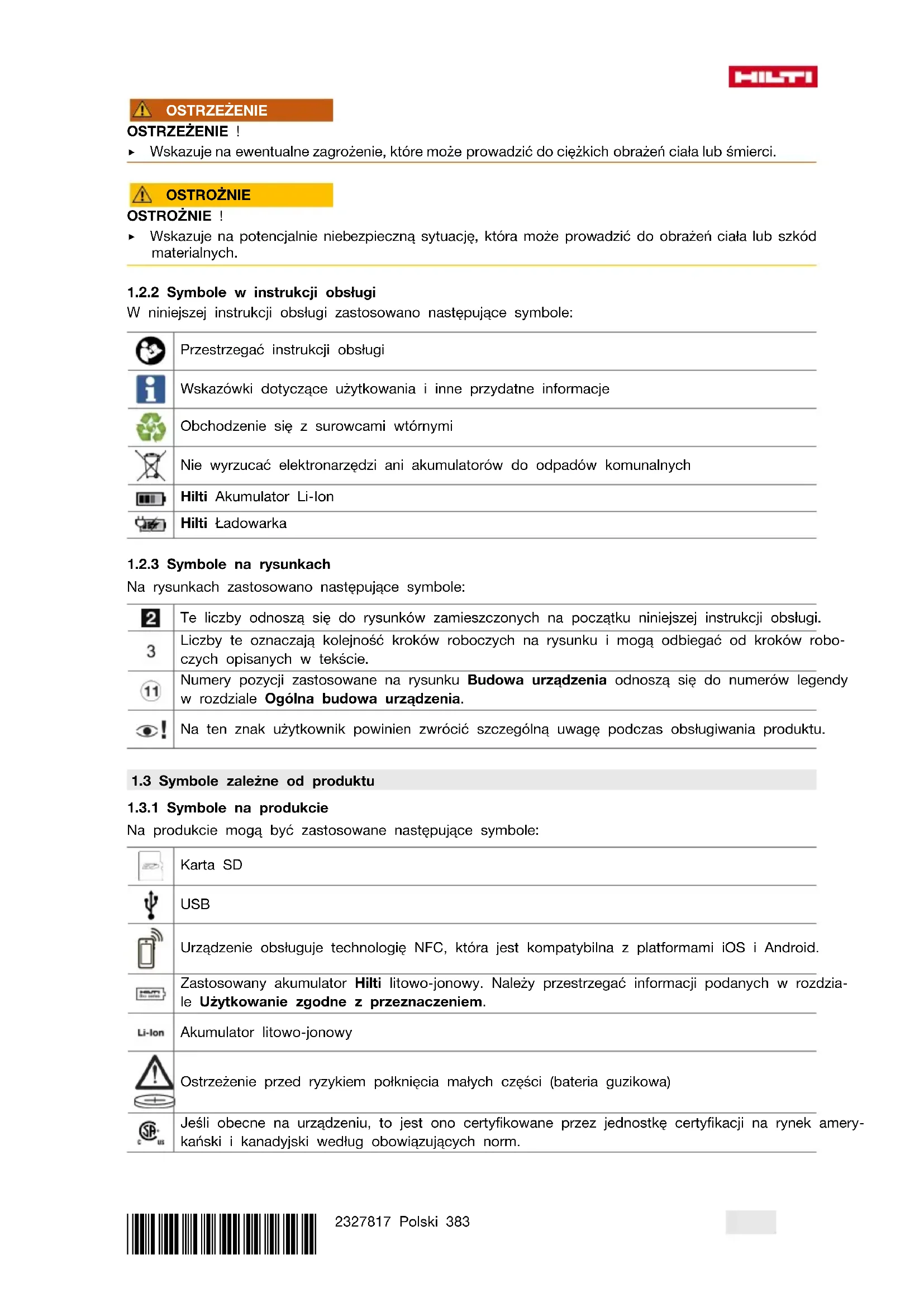 Na produkcie mogą być zastosowane następujące symbole: Karta SD USB Urządzenie obsługuje technologię NFC, która jest kompatybilna z platformami iOS i Android. Zastosowany akumulator Hilti litowo-jonowy. Należy przestrzegać informacji podanych w rozdzia- le Użytkowanie zgodne z przeznaczeniem. Akumulator litowo-jonowy Ostrzeżenie przed ryzykiem połknięcia małych części (bateria guzikowa) Jeśli obecne na urządzeniu, to jest ono certyfikowane przez jednostkę certyfikacji na rynek amery- kański i kanadyjski według obowiązujących norm.384 Polski 2327817 *2327817*