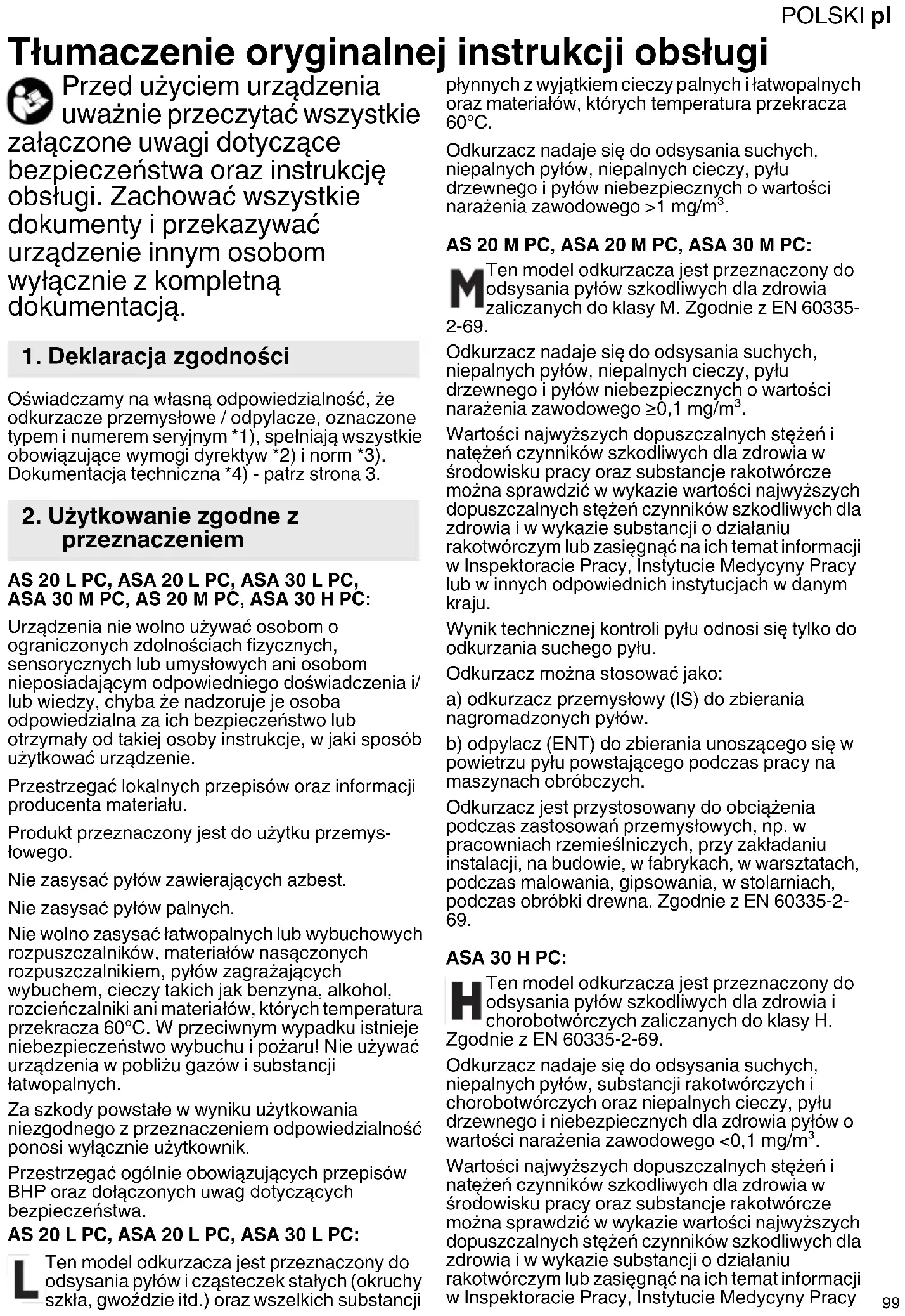 Tłumaczenie oryginalnej instrukcji obsługi Przed użyciem urządzenia uważnie przeczytać wszystkie załączone uwagi dotyczące bezpieczeństwa oraz instrukcję obsługi. Zachować wszystkie dokumenty i przekazywać urządzenie innym osobom wyłącznie z kompletną dokumentacją. Oświadczamy na własną odpowiedzialność, że odkurzacze przemysłowe / odpylacze, oznaczone typem i numerem seryjnym *1), spełniają wszystkie obowiązujące wymogi dyrektyw *2) i norm *3). Dokumentacja techniczna *4) - patrz strona 3. AS 20 L PC, ASA 20 L PC, ASA 30 L PC, ASA 30 M PC, AS 20 M PC, ASA 30 H PC: Urządzenia nie wolno używać osobom o ograniczonych zdolnościach fizycznych, sensorycznych lub umysłowych ani osobom nieposiadającym odpowiedniego doświadczenia i/ lub wiedzy, chyba że nadzoruje je osoba odpowiedzialna za ich bezpieczeństwo lub otrzymały od takiej osoby instrukcje, w jaki sposób użytkować urządzenie. Przestrzegać lokalnych przepisów oraz informacji producenta materiału. Produkt przeznaczony jest do użytku przemys- łowego. Nie zasysać pyłów zawierających azbest. Nie zasysać pyłów palnych. Nie wolno zasysać łatwopalnych lub wybuchowych rozpuszczalników, materiałów nasączonych rozpuszczalnikiem, pyłów zagrażających wybuchem, cieczy takich jak benzyna, alkohol, rozcieńczalniki ani materiałów, których temperatura przekracza 60°C. W przeciwnym wypadku istnieje niebezpieczeństwo wybuchu i pożaru! Nie używać urządzenia w pobliżu gazów i substancji łatwopalnych. Za szkody powstałe w wyniku użytkowania niezgodnego z przeznaczeniem odpowiedzialność ponosi wyłącznie użytkownik. Przestrzegać ogólnie obowiązujących przepisów BHP oraz dołączonych uwag dotyczących bezpieczeństwa. AS 20 L PC, ASA 20 L PC, ASA 30 L PC: Ten model odkurzacza jest przeznaczony do odsysania pyłów i cząsteczek stałych (okruchy szkła, gwoździe itd.) oraz wszelkich substancji płynnych z wyjątkiem cieczy palnych i łatwopalnych oraz materiałów, których temperatura przekracza 60°C. Odkurzacz nadaje się do odsysania suchych, niepalnych pyłów, niepalnych cieczy, pyłu drzewnego i pyłów niebezpiecznych o wartości narażenia zawodowego >1 mg/m³. AS 20 M PC, ASA 20 M PC, ASA 30 M PC: Ten model odkurzacza jest przeznaczony do odsysania pyłów szkodliwych dla zdrowia zaliczanych do klasy M. Zgodnie z EN 60335- 2-69. Odkurzacz nadaje się do odsysania suchych, niepalnych pyłów, niepalnych cieczy, pyłu drzewnego i pyłów niebezpiecznych o wartości narażenia zawodowego ≥0,1 mg/m³. Wartości najwyższych dopuszczalnych stężeń i natężeń czynników szkodliwych dla zdrowia w środowisku pracy oraz substancje rakotwórcze można sprawdzić w wykazie wartości najwyższych dopuszczalnych stężeń czynników szkodliwych dla zdrowia i w wykazie substancji o działaniu rakotwórczym lub zasięgnąć na ich temat informacji w Inspektoracie Pracy, Instytucie Medycyny Pracy lub w innych odpowiednich instytucjach w danym kraju. Wynik technicznej kontroli pyłu odnosi się tylko do odkurzania suchego pyłu. Odkurzacz można stosować jako: a) odkurzacz przemysłowy (IS) do zbierania nagromadzonych pyłów. b) odpylacz (ENT) do zbierania unoszącego się w powietrzu pyłu powstającego podczas pracy na maszynach obróbczych. Odkurzacz jest przystosowany do obciążenia podczas zastosowań przemysłowych, np. w pracowniach rzemieślniczych, przy zakładaniu instalacji, na budowie, w fabrykach, w warsztatach, podczas malowania, gipsowania, w stolarniach, podczas obróbki drewna. Zgodnie z EN 60335-2-