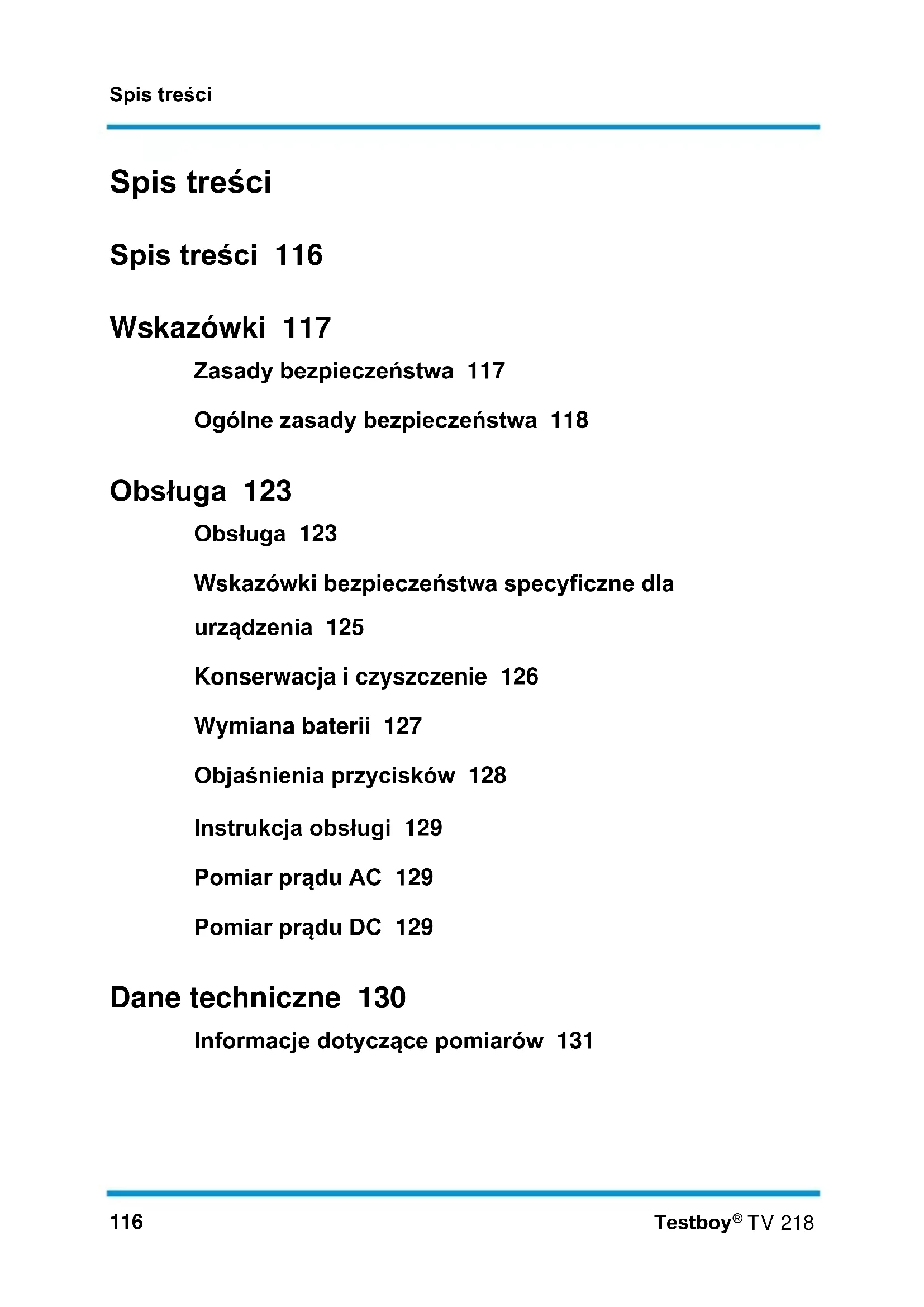 TV 218 Spis treści Spis treści 116 Wskazówki 117 Zasady bezpieczeństwa 117 Ogólne zasady bezpieczeństwa 118 Obsługa 123 Obsługa 123 Wskazówki bezpieczeństwa specyficzne dla urządzenia 125 Konserwacja i czyszczenie 126 Wymiana baterii 127 Objaśnienia przycisków 128 Instrukcja obsługi 129 Pomiar prądu AC 129 Pomiar prądu DC 129 Dane techniczne 130 Informacje dotyczące pomiarów 131Wskazówki Testboy