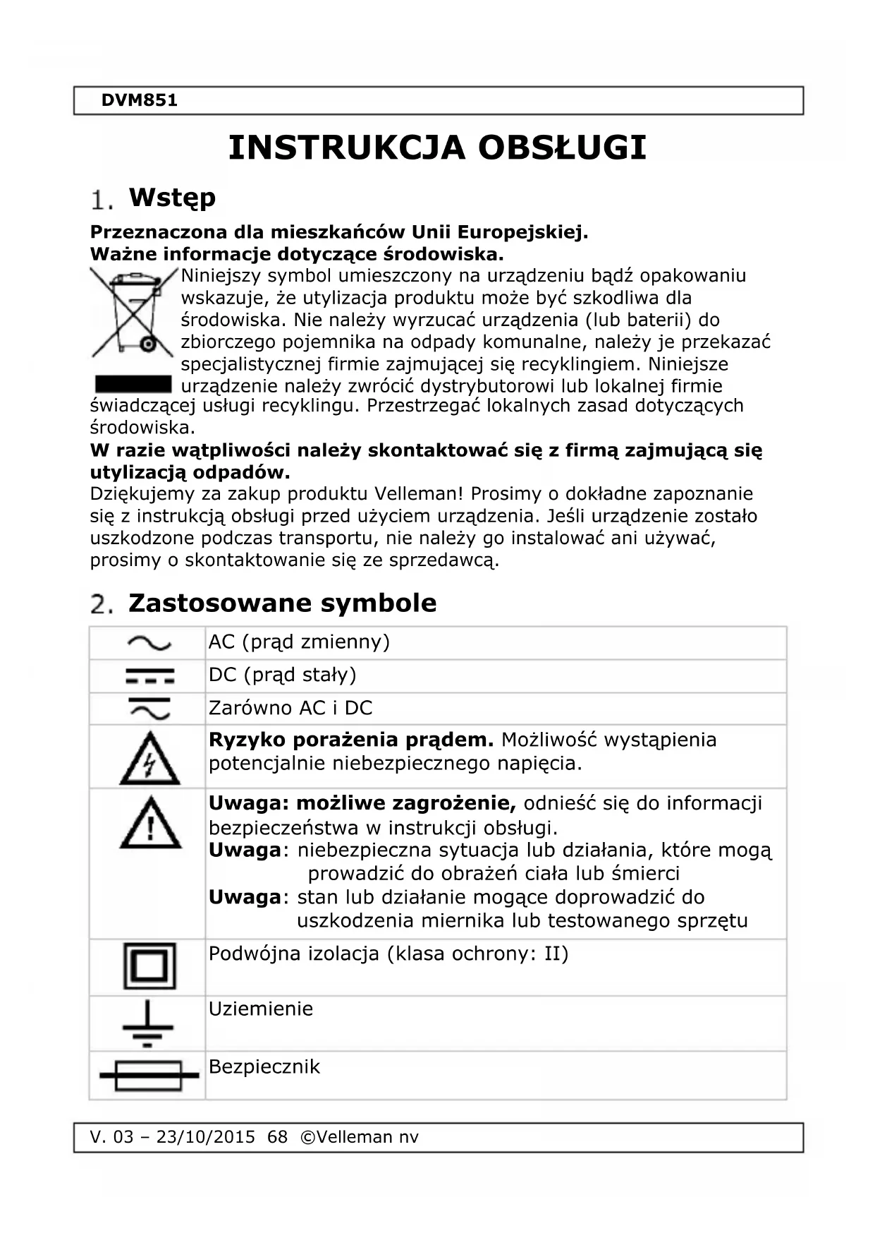 Wstęp Przeznaczona dla mieszkańców Unii Europejskiej. Ważne informacje dotyczące środowiska. Niniejszy symbol umieszczony na urządzeniu bądź opakowaniu wskazuje, że utylizacja produktu może być szkodliwa dla środowiska. Nie należy wyrzucać urządzenia (lub baterii) do zbiorczego pojemnika na odpady komunalne, należy je przekazać specjalistycznej firmie zajmującej się recyklingiem. Niniejsze urządzenie należy zwrócić dystrybutorowi lub lokalnej firmie świadczącej usługi recyklingu. Przestrzegać lokalnych zasad dotyczących środowiska. W razie wątpliwości należy skontaktować się z firmą zajmującą się utylizacją odpadów. Dziękujemy za zakup produktu Velleman! Prosimy o dokładne zapoznanie się z instrukcją obsługi przed użyciem urządzenia. Jeśli urządzenie zostało uszkodzone podczas transportu, nie należy go instalować ani używać, prosimy o skontaktowanie się ze sprzedawcą. Zastosowane symbole