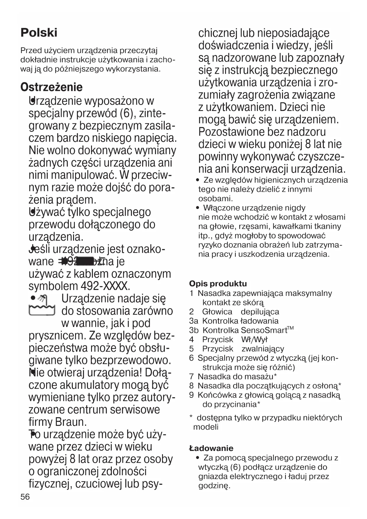 - W celu uzyskania optymalnych warunków poślizgu w czasie depilacji można zastosować żel pod prysznic. Głowica depilująca (2) jest wyposażona w różne nasadki (1, 7 lub 8 w zależności od modelu). W zależności od potrzeb należy wybrać odpowiednią nakładkę: Nasadka do kontaktu ze skórą (1): zapewnia dokładniejszy kontakt ze skórą i dostosowuje się do wszystkich obszarów ciała. Czerwony kolor kontrolki SensoSmart