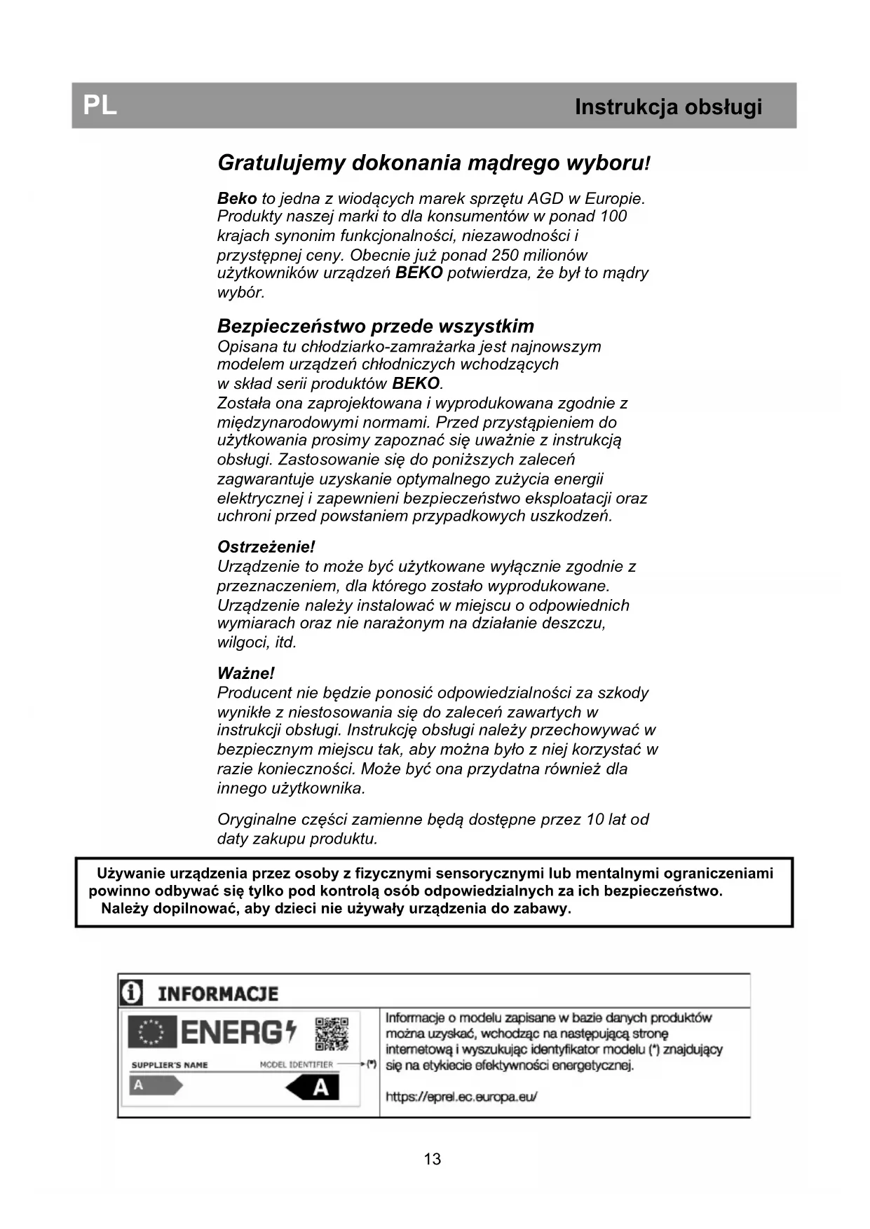- Či je nová zástrčka správne zapojená, ak ste vymenili namontovanú, lisovanú zástrčku. Ak spotrebič po tom všetkom stále nepracuje, kontaktujte servisného technika. Zabezpečte vykonanie vyššie uvedených kontrol, pretože, ak sa nezistí žiadna chyba, môže sa to spoplatniť. 12Gratulujemy dokonania mądrego wyboru! Beko to jedna z wiodących marek sprzętu AGD w Europie. Produkty naszej marki to dla konsumentów w ponad 100 krajach synonim funkcjonalności, niezawodności i przystępnej ceny. Obecnie już ponad 250 milionów użytkowników urządzeń BEKO potwierdza, że był to mądry wybór. Bezpieczeństwo przede wszystkim Opisana tu chłodziarko-zamrażarka jest najnowszym modelem urządzeń chłodniczych wchodzących w skład serii produktów BEKO. Została ona zaprojektowana i wyprodukowana zgodnie z międzynarodowymi normami. Przed przystąpieniem do użytkowania prosimy zapoznać się uważnie z instrukcją obsługi. Zastosowanie się do poniższych zaleceń zagwarantuje uzyskanie optymalnego zużycia energii elektrycznej i zapewnieni bezpieczeństwo eksploatacji oraz uchroni przed powstaniem przypadkowych uszkodzeń. Ostrzeżenie! Urządzenie to może być użytkowane wyłącznie zgodnie z przeznaczeniem, dla którego zostało wyprodukowane. Urządzenie należy instalować w miejscu o odpowiednich wymiarach oraz nie narażonym na działanie deszczu, wilgoci, itd. Ważne! Producent nie będzie ponosić odpowiedzialności za szkody wynikłe z niestosowania się do zaleceń zawartych w instrukcji obsługi. Instrukcję obsługi należy przechowywać w bezpiecznym miejscu tak, aby można było z niej korzystać w razie konieczności. Może być ona przydatna również dla innego użytkownika. Oryginalne części zamienne będą dostępne przez 10 lat od daty zakupu produktu.