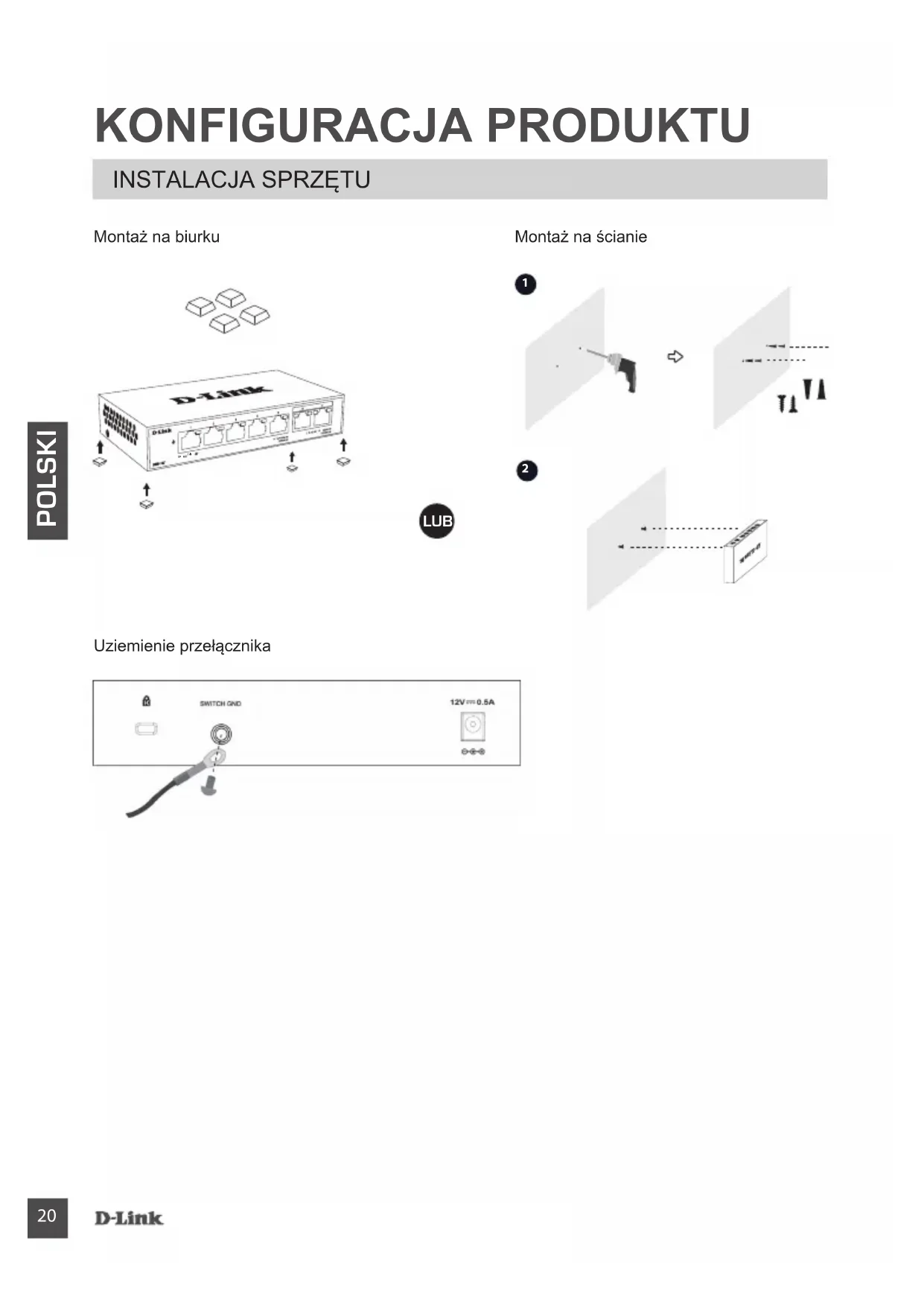 Montaż na biurku Uziemienie przełącznika Montaż na ścianie