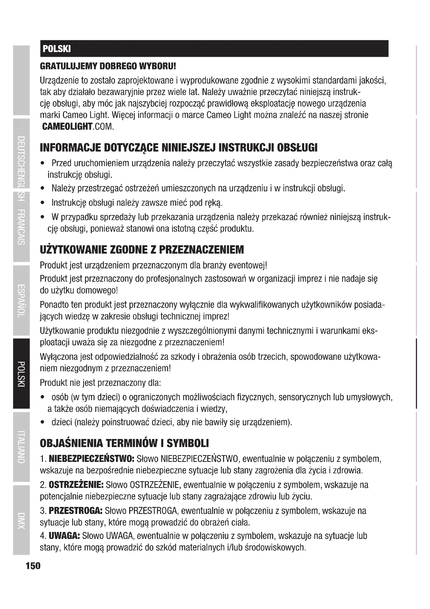 Las declaraciones de conformidad para productos sujetos a las directivas LVD, CEM y RoHS pueden solicitarse a info@adamhall.com Las declaraciones de conformidad de los productos sujetos a la directiva RED pueden descargarse en www.adamhall.com/compliance/ ESTE DOCUMENTO PUEDE ESTAR SUJETO A FALLOS DE IMPRESIÓN O ERRORES, ASÍ COMO A MODIFICACIONES TÉCNICAS O DE OTRO TIPO.150 DMX ITALIANO POLSKI ESPAÑOL FRANCAIS DEUTSCHENGLISH POLSKI GRATULUJEMY DOBREGO WYBORU! Urządzenie to zostało zaprojektowane i wyprodukowane zgodnie z wysokimi standardami jakości, tak aby działało bezawaryjnie przez wiele lat. Należy uważnie przeczytać niniejszą instruk- cję obsługi, aby móc jak najszybciej rozpocząć prawidłową eksploatację nowego urządzenia marki Cameo Light. Więcej informacji o marce Cameo Light można znaleźć na naszej stronie CAMEOLIGHT.COM. INFORMACJE DOTYCZĄCE NINIEJSZEJ INSTRUKCJI OBSŁUGI