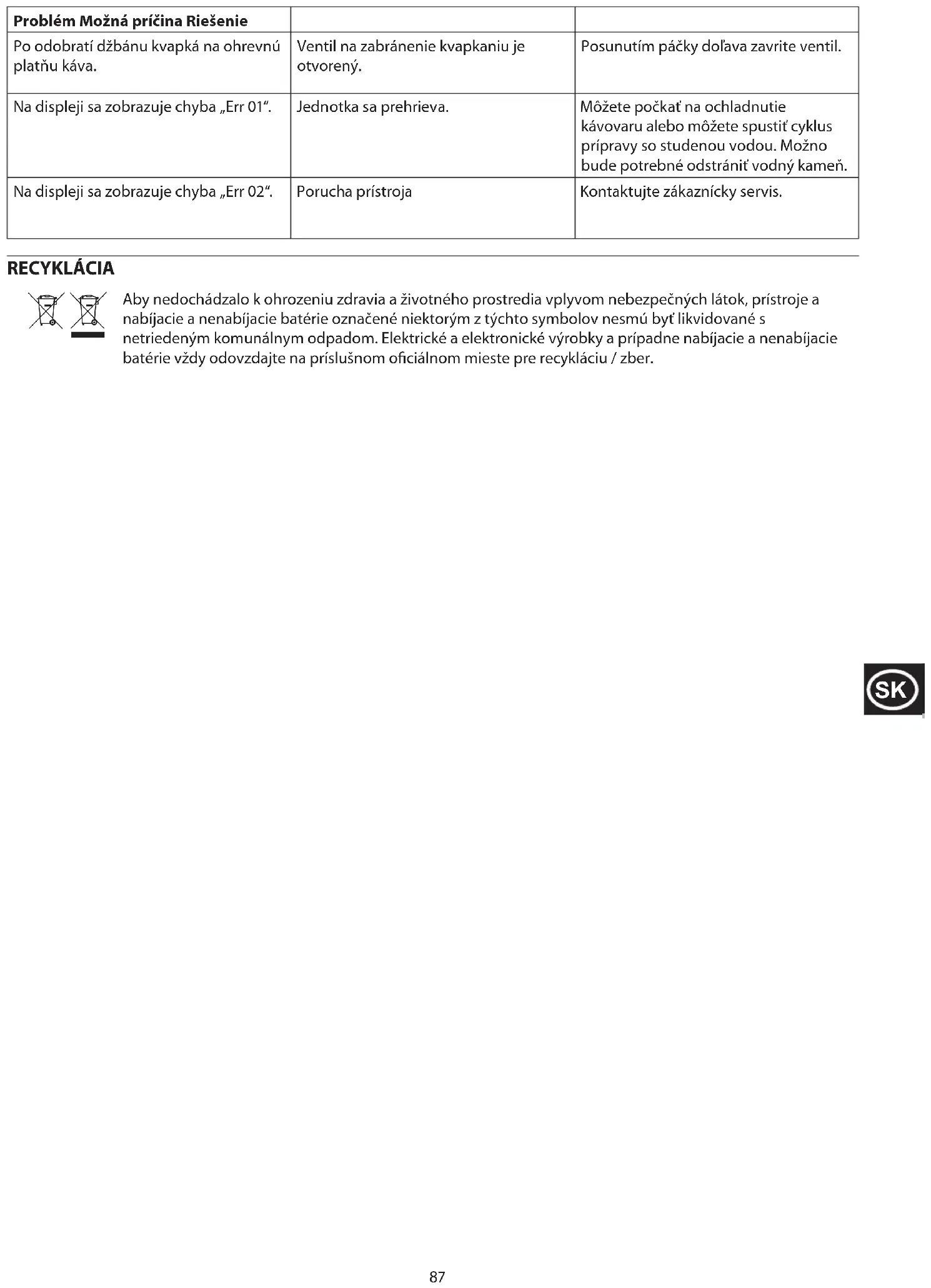 Problem Możliwa przyczyna Rozwiązanie Kawa jest słaba lub jej ilość wydaje się nieprawidłowa Nagromadzenie kamienia Uruchom funkcję czyszczenia z użyciem środka do usuwania kamienia, aby usunąć kamień Panel sterowania nie reaguje na dotyk Zabrudzony panel sterowania Przetrzyj panel sterowania wilgotną ściereczką, a następnie dokładnie wysusz. Po wyjęciu dzbanka kawa kapie na płytę grzejną Zawór zapobiegający kapaniu jest otwarty Przesuń dźwignię w lewo, aby zamknąć zawór Na wyświetlaczu pojawia się "Err 01". Urządzenie przegrzało się Można poczekać, aż ekspres do kawy ostygnie, lub można uruchomić cykl parzenia na zimno. Konieczne może być również odkamienianie. Na wyświetlaczu pojawia się "Err 02". Awaria urządzenia Należy skontaktować się z działem obsługi klienta. RECYKLING