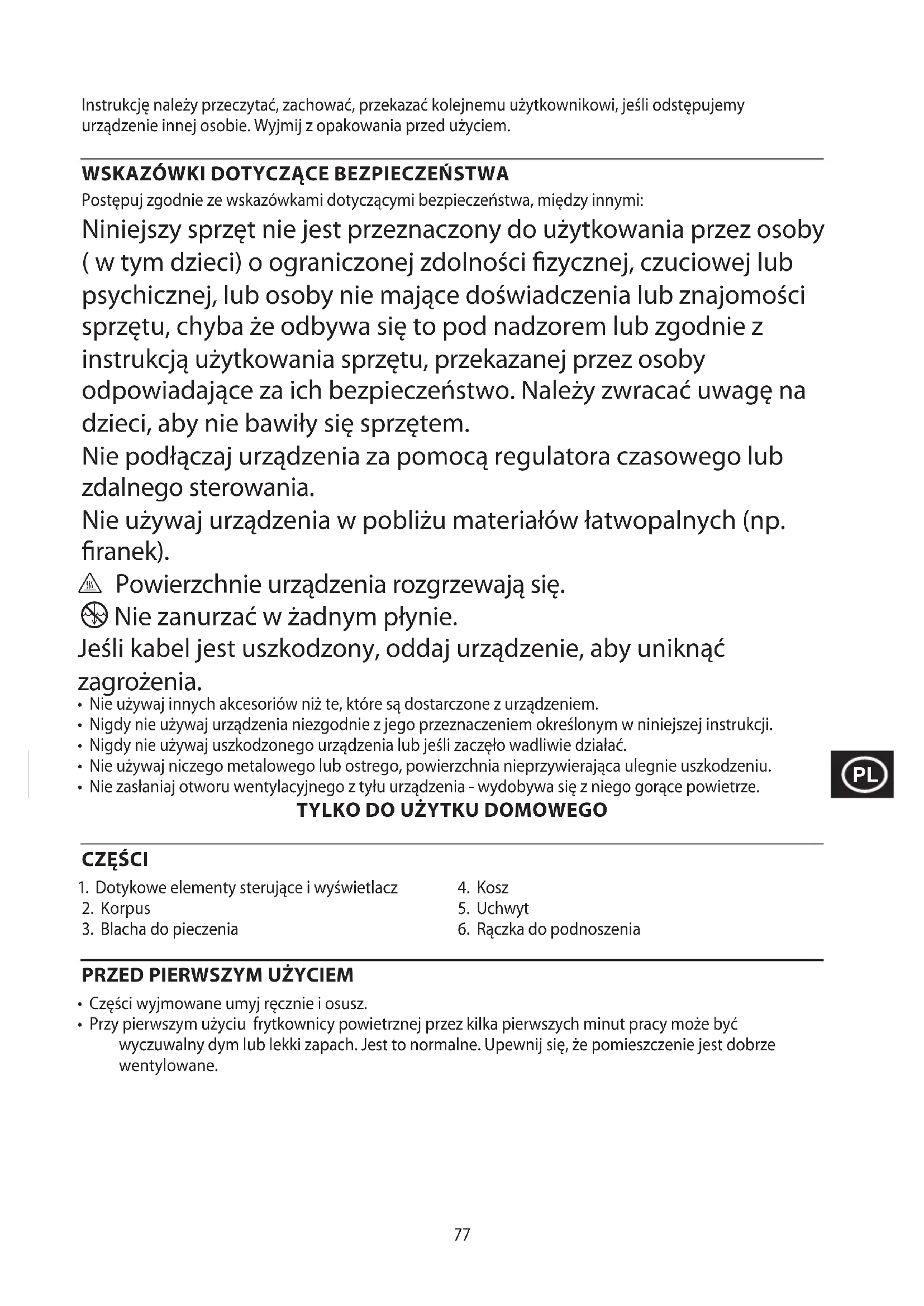 Postępuj zgodnie ze wskazówkami dotyczącymi bezpieczeństwa, między innymi: Niniejszy sprzęt nie jest przeznaczony do użytkowania przez osoby ( w tym dzieci) o ograniczonej zdolności fizycznej, czuciowej lub psychicznej, lub osoby nie mające doświadczenia lub znajomości sprzętu, chyba że odbywa się to pod nadzorem lub zgodnie z instrukcją użytkowania sprzętu, przekazanej przez osoby odpowiadające za ich bezpieczeństwo. Należy zwracać uwagę na dzieci, aby nie bawiły się sprzętem. Nie podłączaj urządzenia za pomocą regulatora czasowego lub zdalnego sterowania. Nie używaj urządzenia w pobliżu materiałów łatwopalnych (np. firanek). ¬ Powierzchnie urządzenia rozgrzewają się. i Nie zanurzać w żadnym płynie. Jeśli kabel jest uszkodzony, oddaj urządzenie, aby uniknąć zagrożenia.