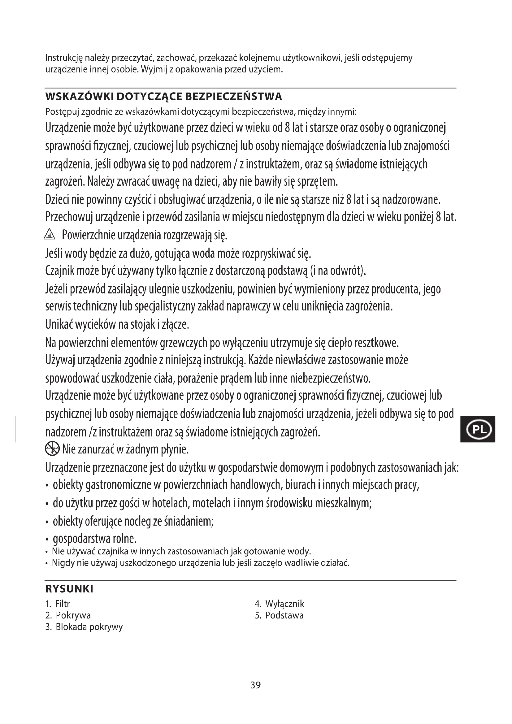 Postępuj zgodnie ze wskazówkami dotyczącymi bezpieczeństwa, między innymi: Urządzenie może być użytkowane przez dzieci w wieku od 8 lat i starsze oraz osoby o ograniczonej sprawności fizycznej, czuciowej lub psychicznej lub osoby niemające doświadczenia lub znajomości urządzenia, jeśli odbywa się to pod nadzorem / z instruktażem, oraz są świadome istniejących zagrożeń. Należy zwracać uwagę na dzieci, aby nie bawiły się sprzętem. Dzieci nie powinny czyścić i obsługiwać urządzenia, o ile nie są starsze niż 8 lat i są nadzorowane. Przechowuj urządzenie i przewód zasilania w miejscu niedostępnym dla dzieci w wieku poniżej 8 lat. h Powierzchnie urządzenia rozgrzewają się. Jeśli wody będzie za dużo, gotująca woda może rozpryskiwać się. Czajnik może być używany tylko łącznie z dostarczoną podstawą (i na odwrót). Jeżeli przewód zasilający ulegnie uszkodzeniu, powinien być wymieniony przez producenta, jego serwis techniczny lub specjalistyczny zakład naprawczy w celu uniknięcia zagrożenia. Unikać wycieków na stojak i złącze. Na powierzchni elementów grzewczych po wyłączeniu utrzymuje się ciepło resztkowe. Używaj urządzenia zgodnie z niniejszą instrukcją. Każde niewłaściwe zastosowanie może spowodować uszkodzenie ciała, porażenie prądem lub inne niebezpieczeństwo. Urządzenie może być użytkowane przez osoby o ograniczonej sprawności fizycznej, czuciowej lub psychicznej lub osoby niemające doświadczenia lub znajomości urządzenia, jeżeli odbywa się to pod nadzorem /z instruktażem oraz są świadome istniejących zagrożeń.