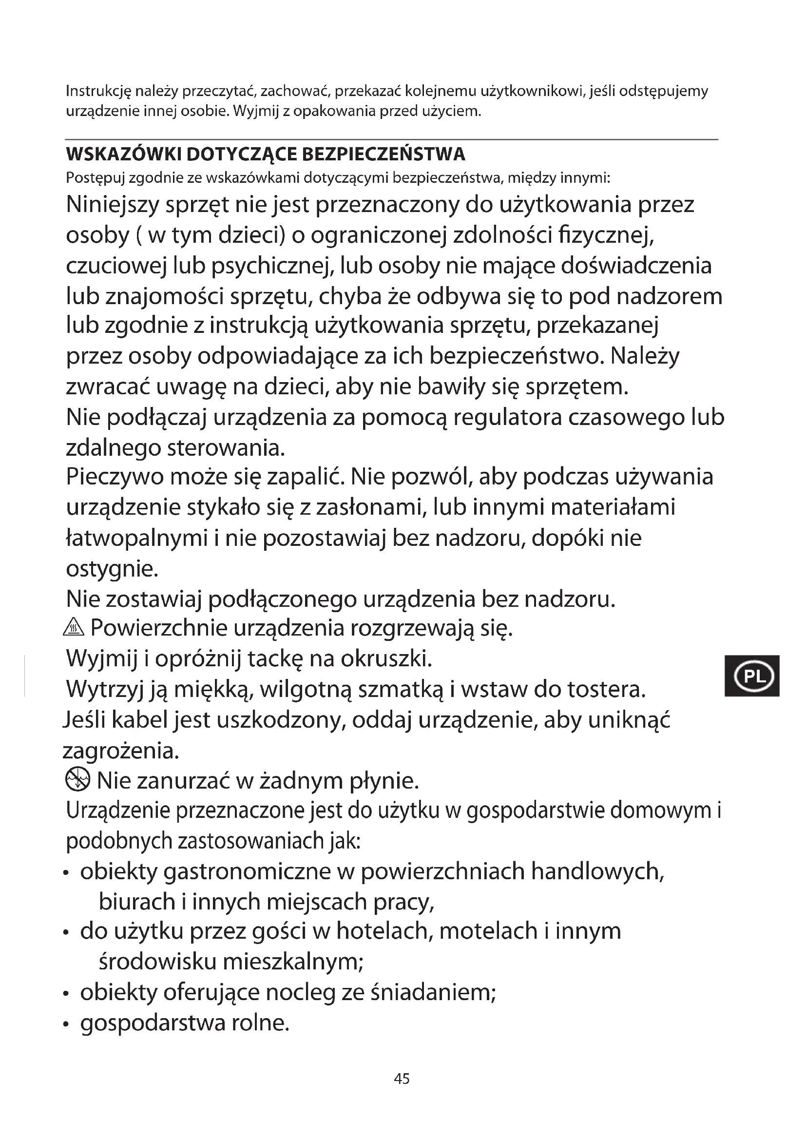 Postępuj zgodnie ze wskazówkami dotyczącymi bezpieczeństwa, między innymi: Niniejszy sprzęt nie jest przeznaczony do użytkowania przez osoby ( w tym dzieci) o ograniczonej zdolności fizycznej, czuciowej lub psychicznej, lub osoby nie mające doświadczenia lub znajomości sprzętu, chyba że odbywa się to pod nadzorem lub zgodnie z instrukcją użytkowania sprzętu, przekazanej przez osoby odpowiadające za ich bezpieczeństwo. Należy zwracać uwagę na dzieci, aby nie bawiły się sprzętem. Nie podłączaj urządzenia za pomocą regulatora czasowego lub zdalnego sterowania. Pieczywo może się zapalić. Nie pozwól, aby podczas używania urządzenie stykało się z zasłonami, lub innymi materiałami łatwopalnymi i nie pozostawiaj bez nadzoru, dopóki nie ostygnie. Nie zostawiaj podłączonego urządzenia bez nadzoru. h Powierzchnie urządzenia rozgrzewają się. Wyjmij i opróżnij tackę na okruszki. Wytrzyj ją miękką, wilgotną szmatką i wstaw do tostera. Jeśli kabel jest uszkodzony, oddaj urządzenie, aby uniknąć zagrożenia. i Nie zanurzać w żadnym płynie. Urządzenie przeznaczone jest do użytku w gospodarstwie domowym i podobnych zastosowaniach jak: