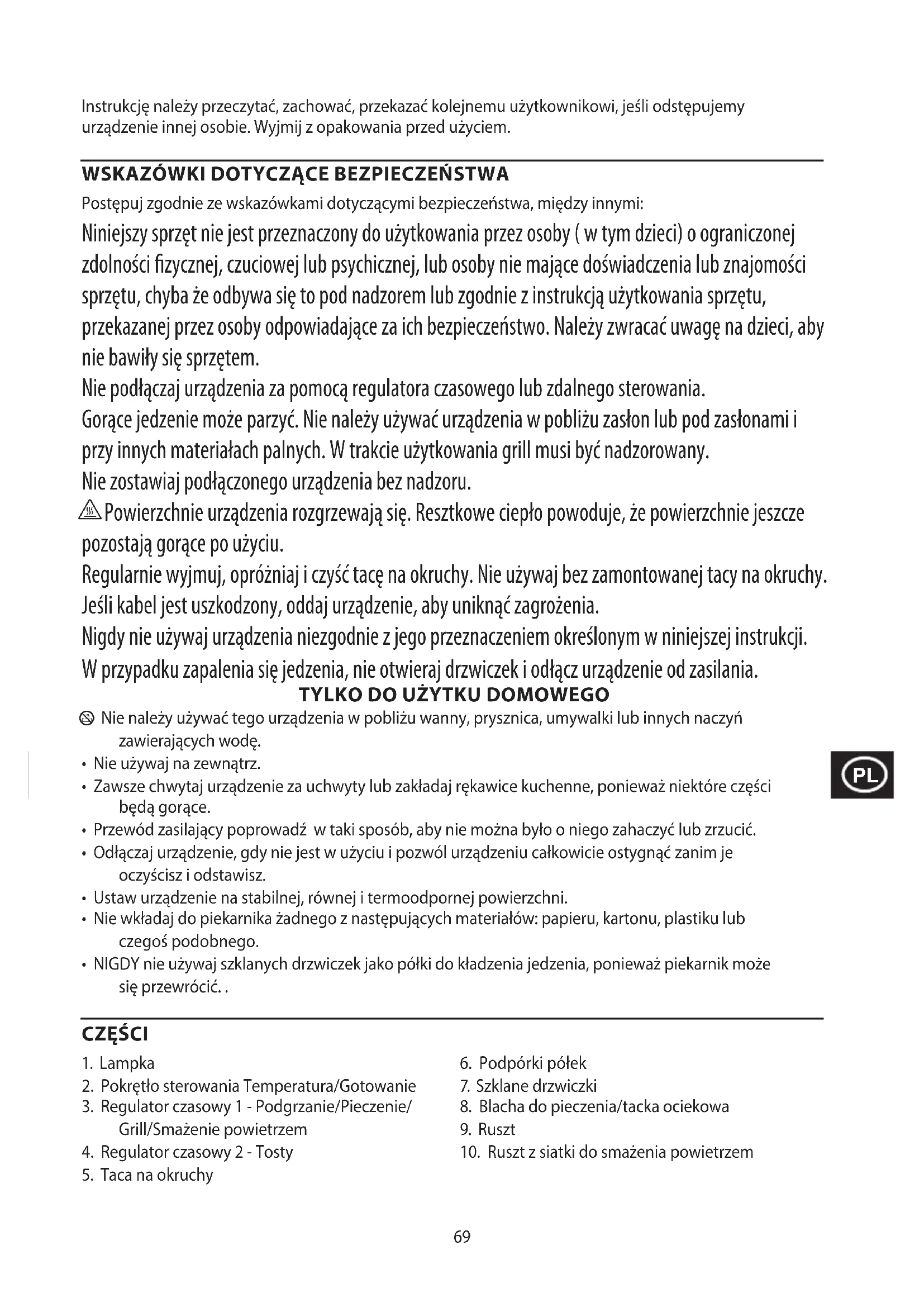 Powierzchnie urządzenia rozgrzewają się. Resztkowe ciepło powoduje, że powierzchnie jeszcze pozostają gorące po użyciu. Regularnie wyjmuj, opróżniaj i czyść tacę na okruchy. Nie używaj bez zamontowanej tacy na okruchy. Jeśli kabel jest uszkodzony, oddaj urządzenie, aby uniknąć zagrożenia. Nigdy nie używaj urządzenia niezgodnie z jego przeznaczeniem określonym w niniejszej instrukcji. W przypadku zapalenia się jedzenia, nie otwieraj drzwiczek i odłącz urządzenie od zasilania.