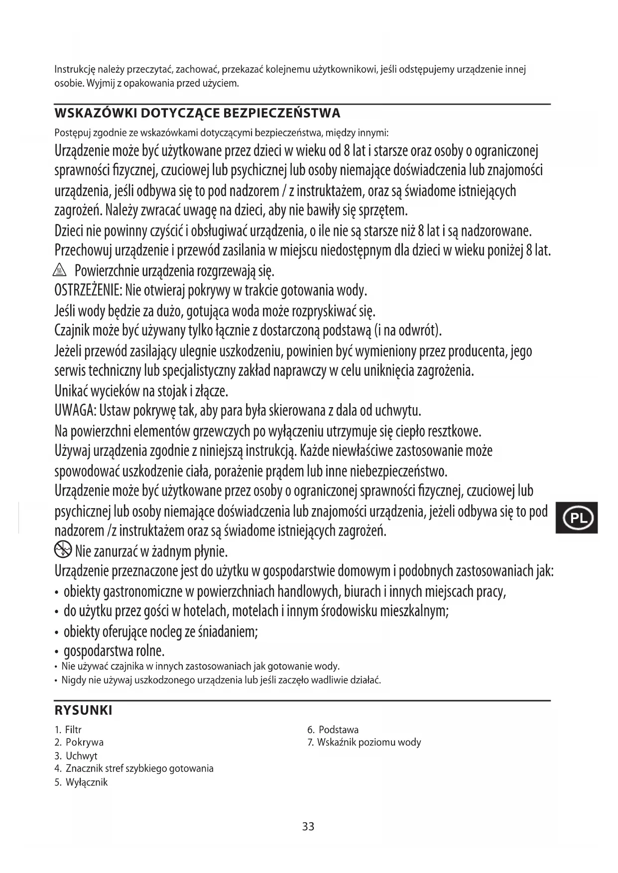 Postępuj zgodnie ze wskazówkami dotyczącymi bezpieczeństwa, między innymi: Urządzenie może być użytkowane przez dzieci w wieku od 8 lat i starsze oraz osoby o ograniczonej sprawności fizycznej, czuciowej lub psychicznej lub osoby niemające doświadczenia lub znajomości urządzenia, jeśli odbywa się to pod nadzorem / z instruktażem, oraz są świadome istniejących zagrożeń. Należy zwracać uwagę na dzieci, aby nie bawiły się sprzętem. Dzieci nie powinny czyścić i obsługiwać urządzenia, o ile nie są starsze niż 8 lat i są nadzorowane. Przechowuj urządzenie i przewód zasilania w miejscu niedostępnym dla dzieci w wieku poniżej 8 lat. h Powierzchnie urządzenia rozgrzewają się. OSTRZEŻENIE: Nie otwieraj pokrywy w trakcie gotowania wody. Jeśli wody będzie za dużo, gotująca woda może rozpryskiwać się. Czajnik może być używany tylko łącznie z dostarczoną podstawą (i na odwrót). Jeżeli przewód zasilający ulegnie uszkodzeniu, powinien być wymieniony przez producenta, jego serwis techniczny lub specjalistyczny zakład naprawczy w celu uniknięcia zagrożenia. Unikać wycieków na stojak i złącze. UWAGA: Ustaw pokrywę tak, aby para była skierowana z dala od uchwytu. Na powierzchni elementów grzewczych po wyłączeniu utrzymuje się ciepło resztkowe. Używaj urządzenia zgodnie z niniejszą instrukcją. Każde niewłaściwe zastosowanie może spowodować uszkodzenie ciała, porażenie prądem lub inne niebezpieczeństwo. Urządzenie może być użytkowane przez osoby o ograniczonej sprawności fizycznej, czuciowej lub psychicznej lub osoby niemające doświadczenia lub znajomości urządzenia, jeżeli odbywa się to pod nadzorem /z instruktażem oraz są świadome istniejących zagrożeń.