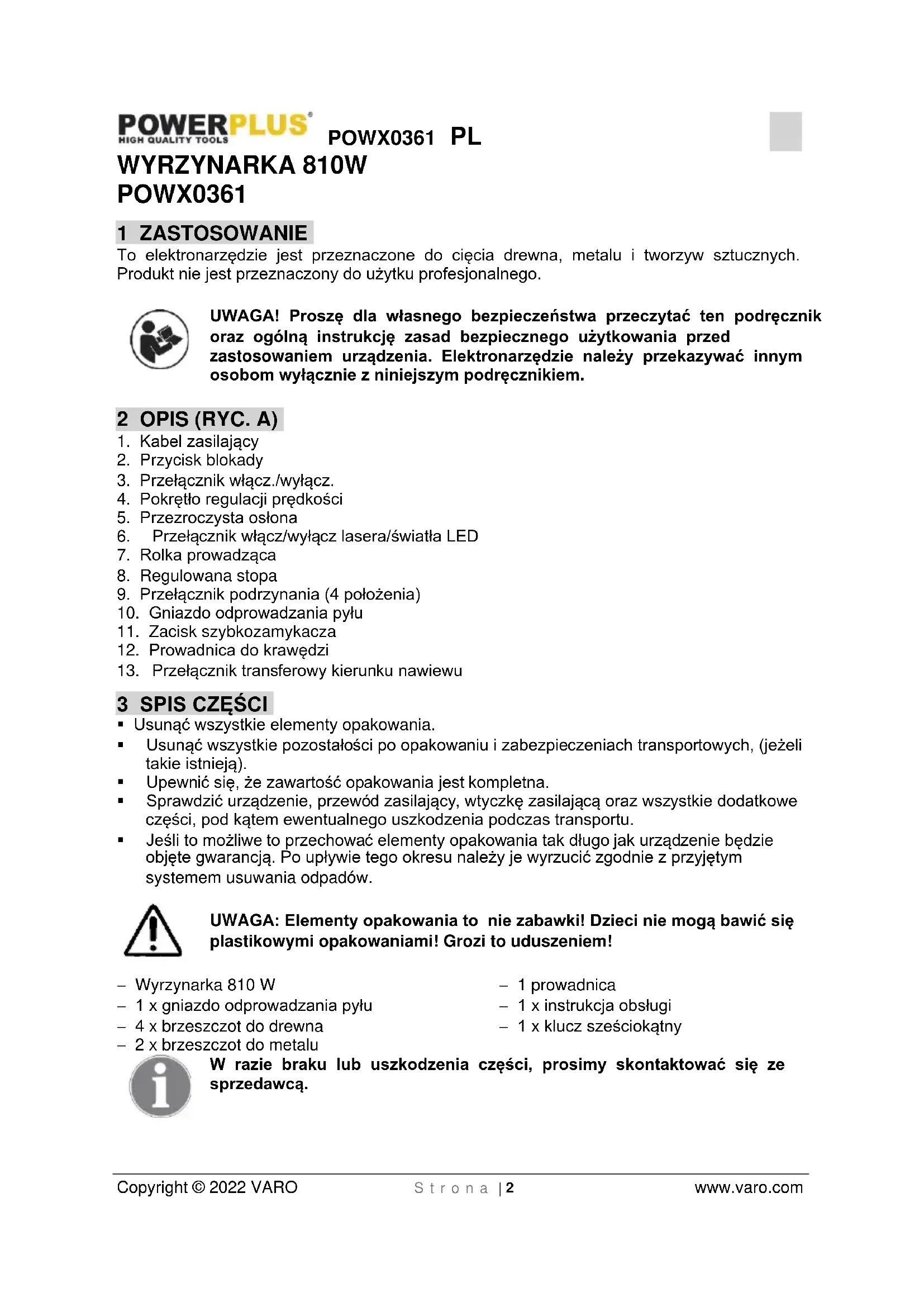 Copyright © 2022 VARO S t r o n a | 2 www.varo.com WYRZYNARKA 810W POWX0361 1 ZASTOSOWANIE To elektronarzędzie jest przeznaczone do cięcia drewna, metalu i tworzyw sztucznych. Produkt nie jest przeznaczony do użytku profesjonalnego. UWAGA! Proszę dla własnego bezpieczeństwa przeczytać ten podręcznik oraz ogólną instrukcję zasad bezpiecznego użytkowania przed zastosowaniem urządzenia. Elektronarzędzie należy przekazywać innym osobom wyłącznie z niniejszym podręcznikiem. 2 OPIS (RYC. A)