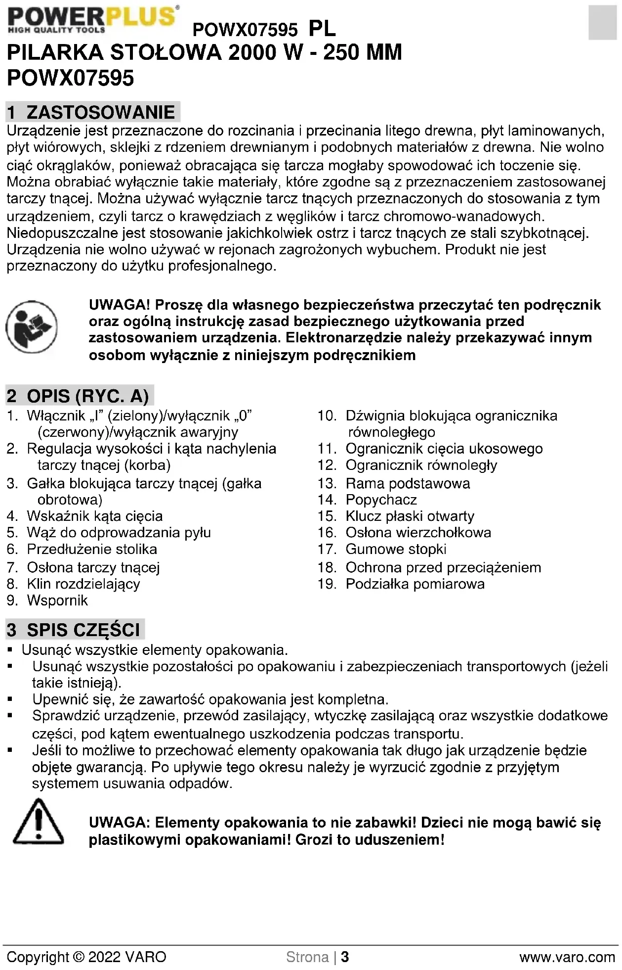 - Jeśli to możliwe to przechować elementy opakowania tak długo jak urządzenie będzie objęte gwarancją. Po upływie tego okresu należy je wyrzucić zgodnie z przyjętym systemem usuwania odpadów. UWAGA: Elementy opakowania to nie zabawki! Dzieci nie mogą bawić się plastikowymi opakowaniami! Grozi to uduszeniem!POWX07595 PL Copyright © 2022 VARO Strona | 4 www.varo.com Pilarka stołowa 2000 W Zamontowana tarcza tnąca Osłona ostrza 3 przedłużenie stolika pilarki 6 wsporników Prowadnica równoległa Prowadnica kątowa Popychacz 2 klucze do wymiany tarczy Torba z drobnymi częściami Przewód odsysający 2 osłona wierzchołkowa 4 nóżki podporowe Instrukcja obsługi W razie braku lub uszkodzenia części, prosimy skontaktować się ze sprzedawcą.