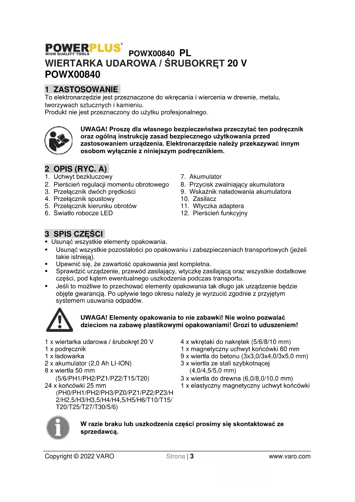 Używać jedynie akumulatorów i ładowarek przeznaczonych dla tego narzędzia.POWX00840 PL Copyright © 2022 VARO Strona | 7 www.varo.com