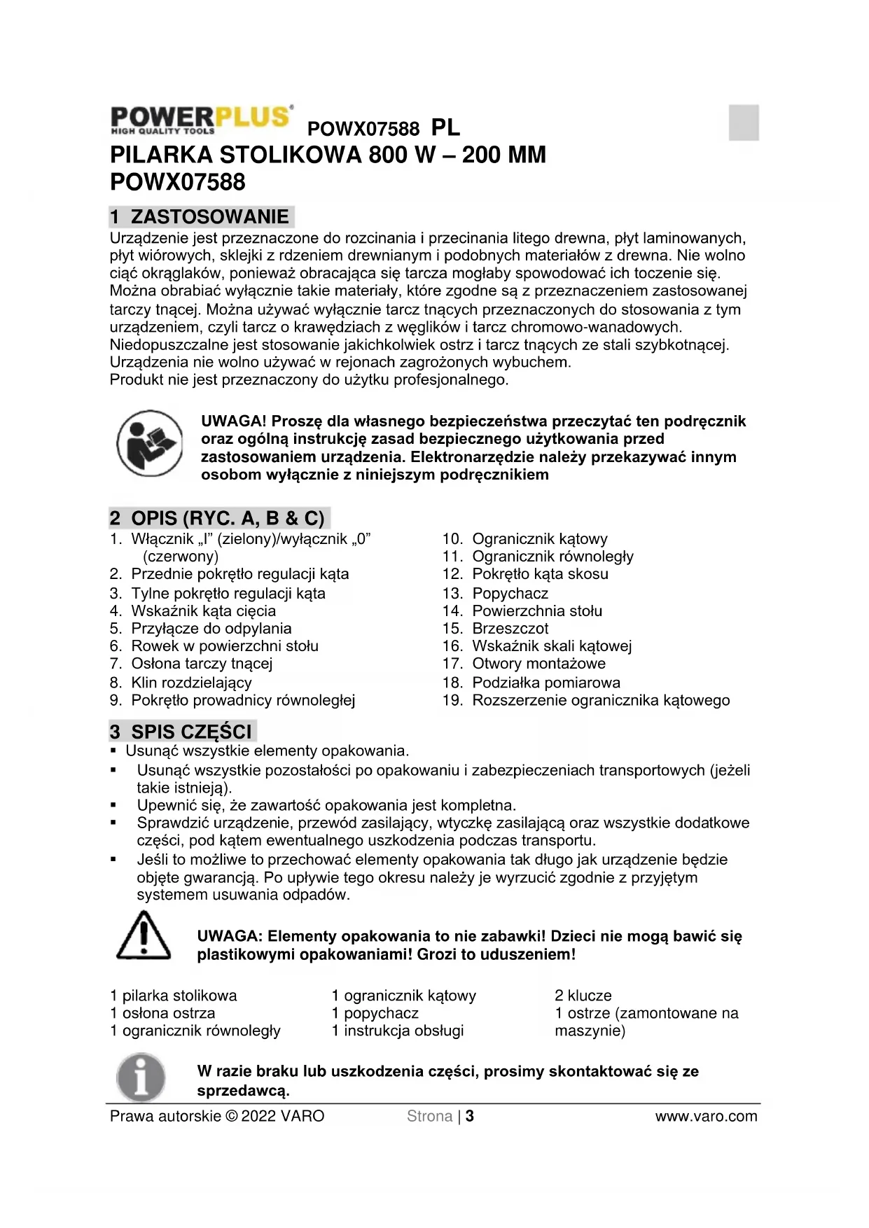 - Jeśli to możliwe to przechować elementy opakowania tak długo jak urządzenie będzie objęte gwarancją. Po upływie tego okresu należy je wyrzucić zgodnie z przyjętym systemem usuwania odpadów. UWAGA: Elementy opakowania to nie zabawki! Dzieci nie mogą bawić się plastikowymi opakowaniami! Grozi to uduszeniem! 1 pilarka stolikowa 1 osłona ostrza 1 ogranicznik równoległy 1 ogranicznik kątowy 1 popychacz 1 instrukcja obsługi 2 klucze 1 ostrze (zamontowane na maszynie) W razie braku lub uszkodzenia części, prosimy skontaktować się ze sprzedawcą.POWX07588 PL Prawa autorskie © 2022 VARO Strona | 4 www.varo.com 4 OZNACZENIA W niniejszej instrukcji i/lub na urządzeniu użyto następujących symboli: