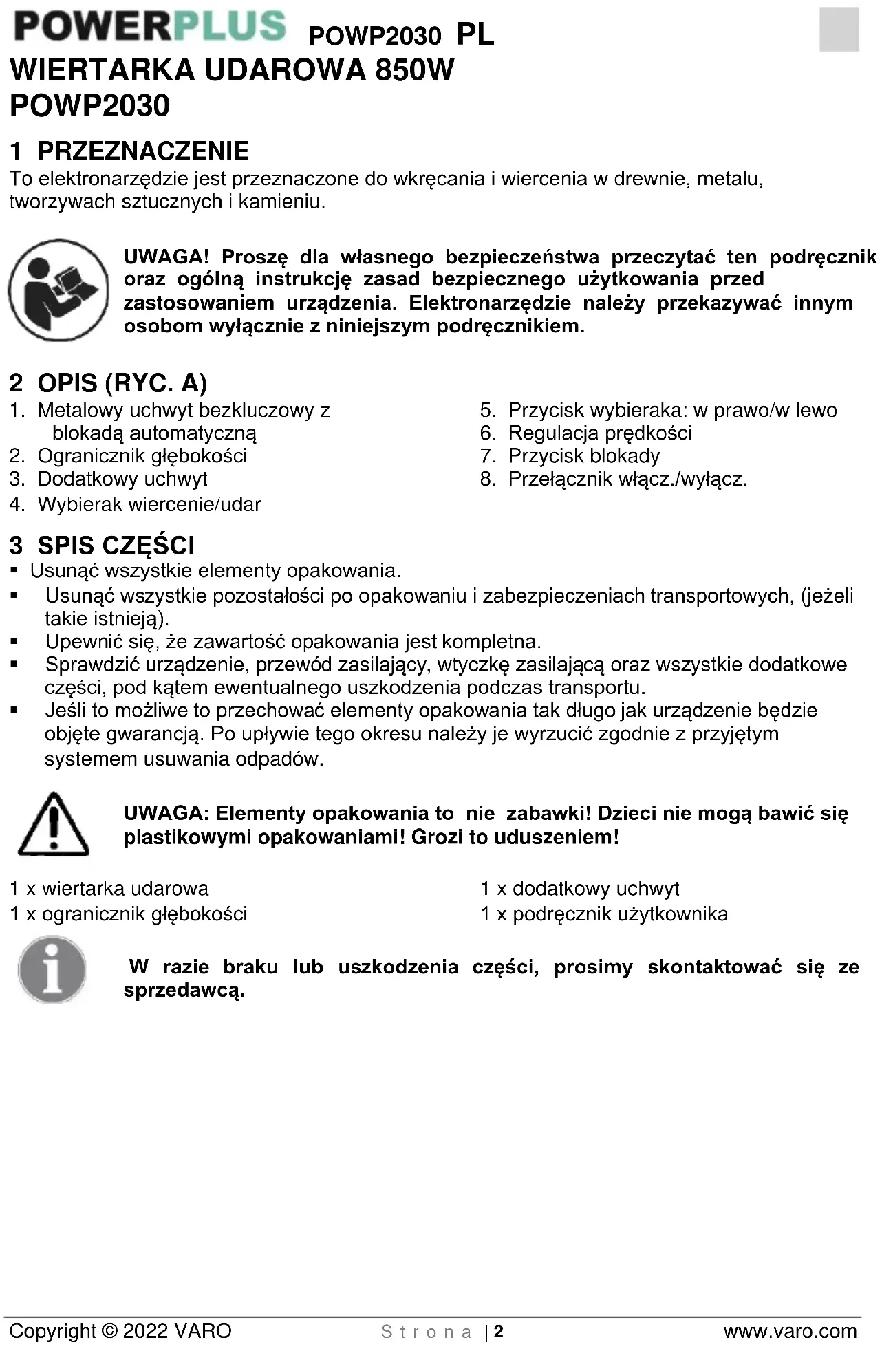 - Należy zaznaczyć, że żadne roszczenie w ramach gwarancji nie jest możliwe, jeśli uszkodzenie urządzenia będzie spowodowane niestaranną konserwacją lub przeciążeniem urządzenia.POWP2030 PL Copyright © 2022 VARO S t r o n a | 8 www.varo.com