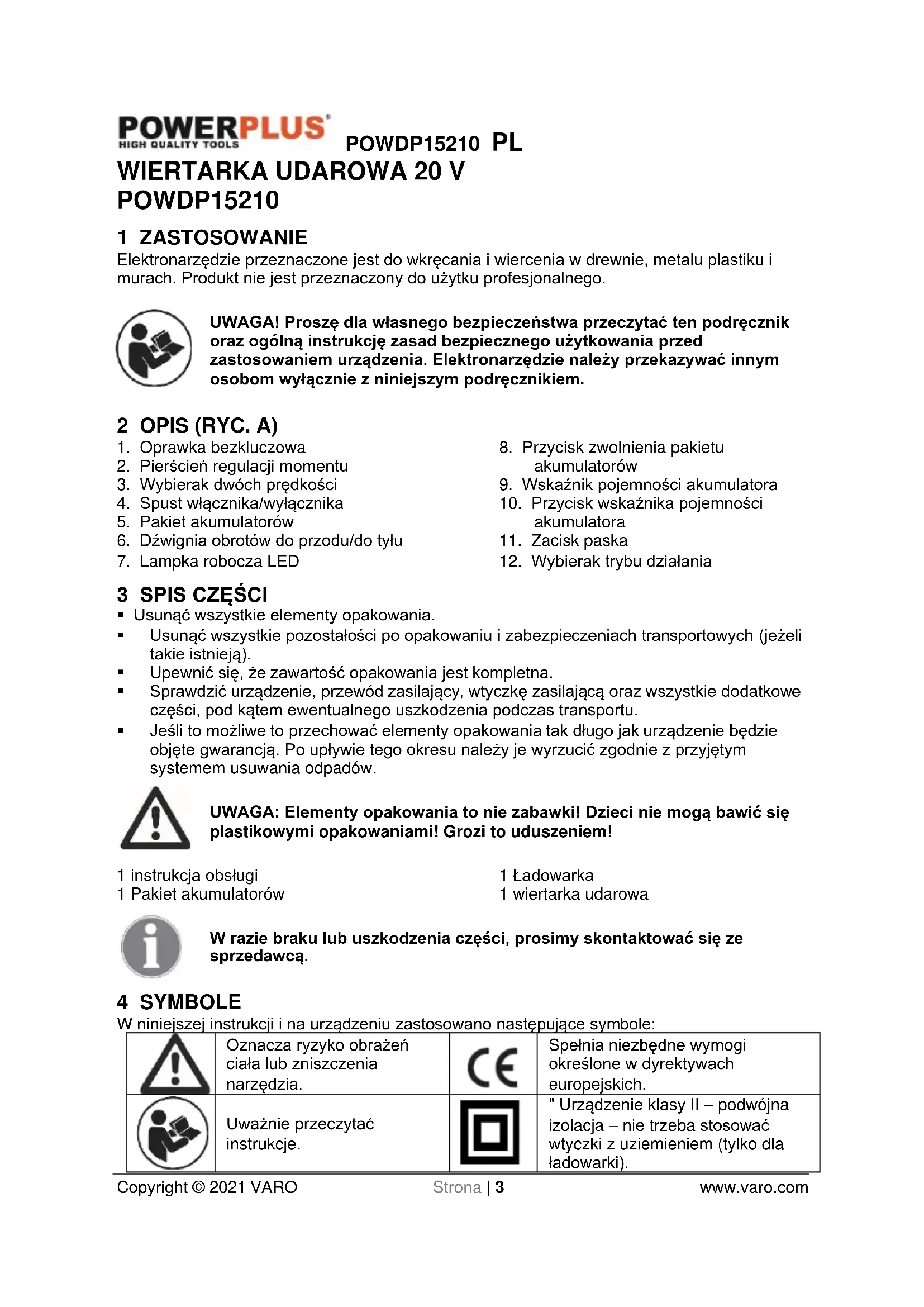 VARO – Vic. Van Rompuy N.V. - Joseph Van Instraat 9 - BE2500 Lier - BELGIA oświadcza, że produkt: Wiertarka udarowa 20 V znak towarowy: PowerPlus model: POWDP15200 spełnia niezbędne wymogi i inne stosowne postanowienia odpowiednich dyrektyw europejskich, opartych na zastosowaniu europejskich norm zharmonizowanych. Wszelkie nieuprawnione modyfikacje urządzenia spowodują unieważnienie niniejszej deklaracji. Dyrektywy europejskie (wraz z wszelkimi dyrektywami je zmieniającymi, aż do dnia podpisania): 2011/65/EU 2006/42/ЕС 2014/30/EU Europejskie normy zharmonizowane (wraz z wszelkimi dyrektywami je zmieniającymi, aż do dnia podpisania): EN62841-1 : 2015 EN62841-2-1 : 2018 EN55014-1 : 2017 EN55014-2 : 2015 Osoba odpowiedzialna za przechowywanie dokumentacji technicznej: Philippe Vankerkhove, VARO – Vic. Van Rompuy N.V. Niżej podpisany działa w imieniu zarządu firmy, na podstawie udzielonego mu pełnomocnictwa, Ludo Mertens Specjalista ds. Regulacyjnych – Dyrektor ds. Zgodności z Przepisami 24/03/2021, Lier - BelgiumPOWDP15210 HU Copyright © 2021 VARO O l d a l | 1 www.varo.com 1 ALKALMAZÁS ................................................................................ 3