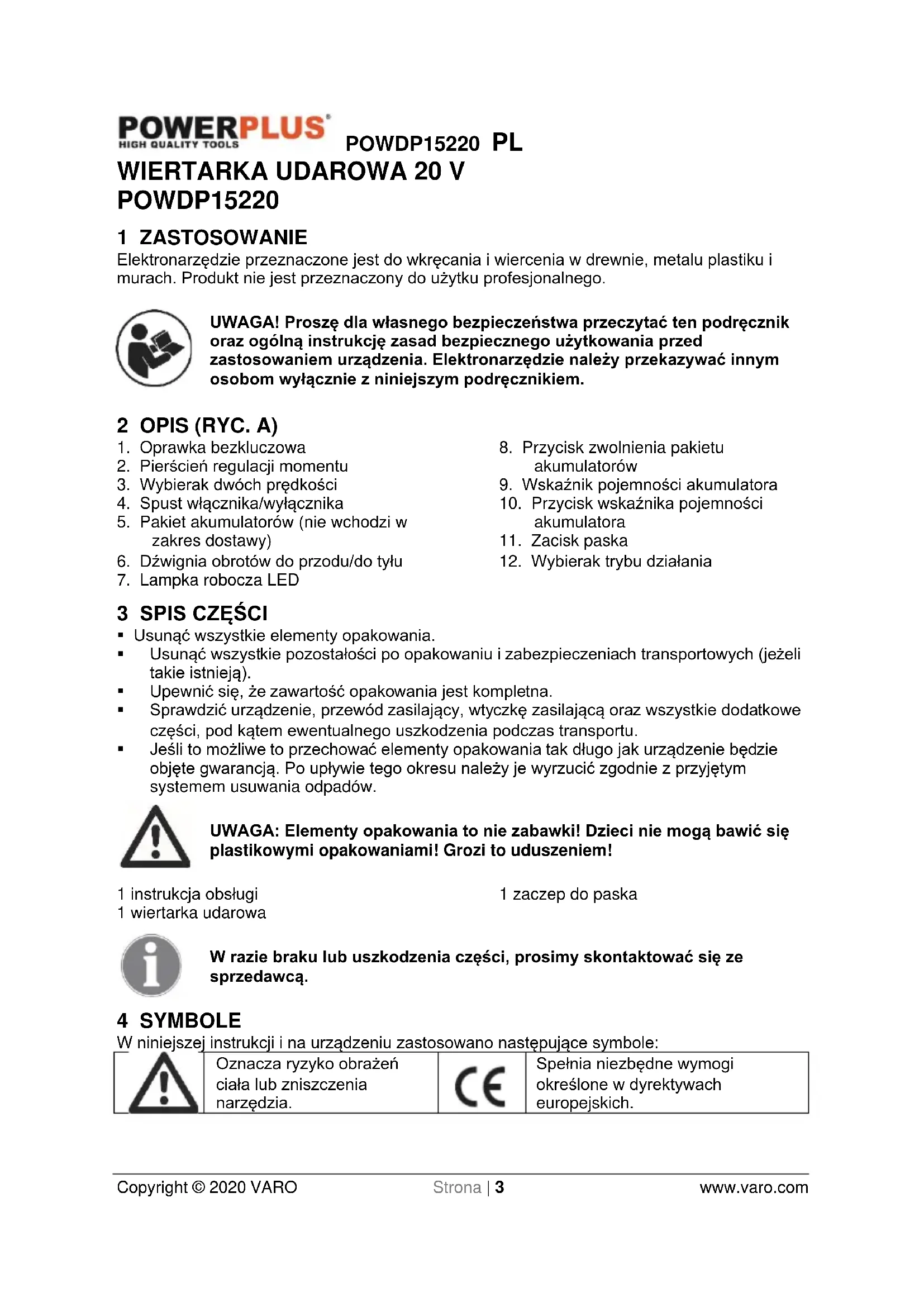Spełnia niezbędne wymogi określone w dyrektywach europejskich.POWDP15220 PL Copyright © 2020 VARO Strona | 4 www.varo.com