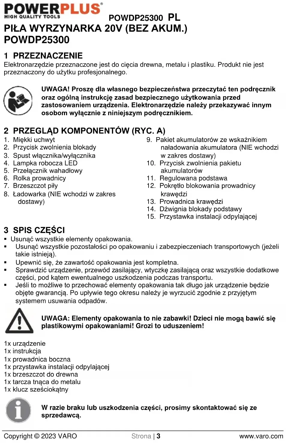 - Jeśli to możliwe to przechować elementy opakowania tak długo jak urządzenie będzie objęte gwarancją. Po upływie tego okresu należy je wyrzucić zgodnie z przyjętym systemem usuwania odpadów. UWAGA: Elementy opakowania to nie zabawki! Dzieci nie mogą bawić się plastikowymi opakowaniami! Grozi to uduszeniem! 1x urządzenie 1x instrukcja 1x prowadnica boczna 1x przystawka instalacji odpylającej 1x brzeszczot do drewna 1x tarcza tnąca do metalu 1x klucz sześciokątny W razie braku lub uszkodzenia części, prosimy skontaktować się ze sprzedawcą.POWDP25300 PL Copyright © 2023 VARO Strona | 4 www.varo.com 4 SYMBOLE W niniejszej instrukcji i na urządzeniu zastosowano następujące symbole: