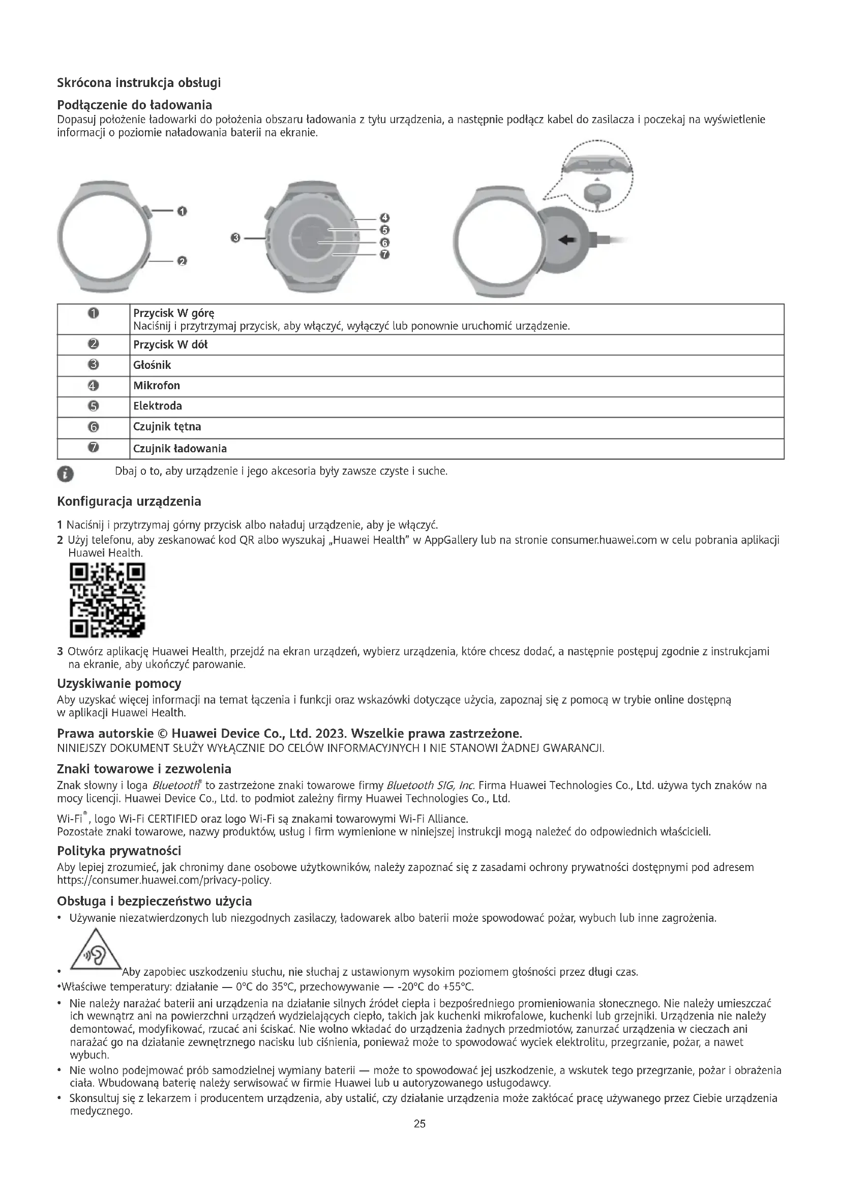 Czujnik ładowania Dbaj o to, aby urządzenie i jego akcesoria były zawsze czyste i suche. Konguracja urządzenia 1 Naciśnij i przytrzymaj górny przycisk albo naładuj urządzenie, aby je włączyć. 2 Użyj telefonu, aby zeskanować kod QR albo wyszukaj „Huawei Health” w AppGallery lub na stronie consumer.huawei.com w celu pobrania aplikacji Huawei Health. 3 Otwórz aplikację Huawei Health, przejdź na ekran urządzeń, wybierz urządzenia, które chcesz dodać, a następnie postępuj zgodnie z instrukcjami na ekranie, aby ukończyć parowanie. Uzyskiwanie pomocy Aby uzyskać więcej informacji na temat łączenia i funkcji oraz wskazówki dotyczące użycia, zapoznaj się z pomocą w trybie online dostępną w aplikacji Huawei Health. Prawa autorskie © Huawei Device Co., Ltd. 2023. Wszelkie prawa zastrzeżone. NINIEJSZY DOKUMENT SŁUŻY WYŁĄCZNIE DO CELÓW INFORMACYJNYCH I NIE STANOWI ŻADNEJ GWARANCJI. Znaki towarowe i zezwolenia Znak słowny i loga Bluetooth