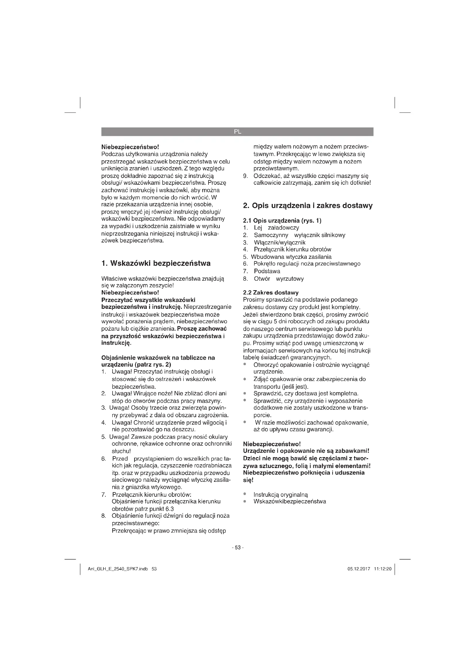 Niebezpieczeństwo! Podczas użytkowania urządzenia należy przestrzegać wskazówek bezpieczeństwa w celu uniknięcia zranień i uszkodzeń. Z tego względu proszę dokładnie zapoznać się z instrukcją obsługi/ wskazówkami bezpieczeństwa. Proszę zachować instrukcję i wskazówki, aby można było w każdym momencie do nich wrócić. W razie przekazania urządzenia innej osobie, proszę wręczyć jej również instrukcję obsługi/ wskazówki bezpieczeństwa. Nie odpowiadamy za wypadki i uszkodzenia zaistniałe w wyniku nieprzestrzegania niniejszej instrukcji i wska- zówek bezpieczeństwa.