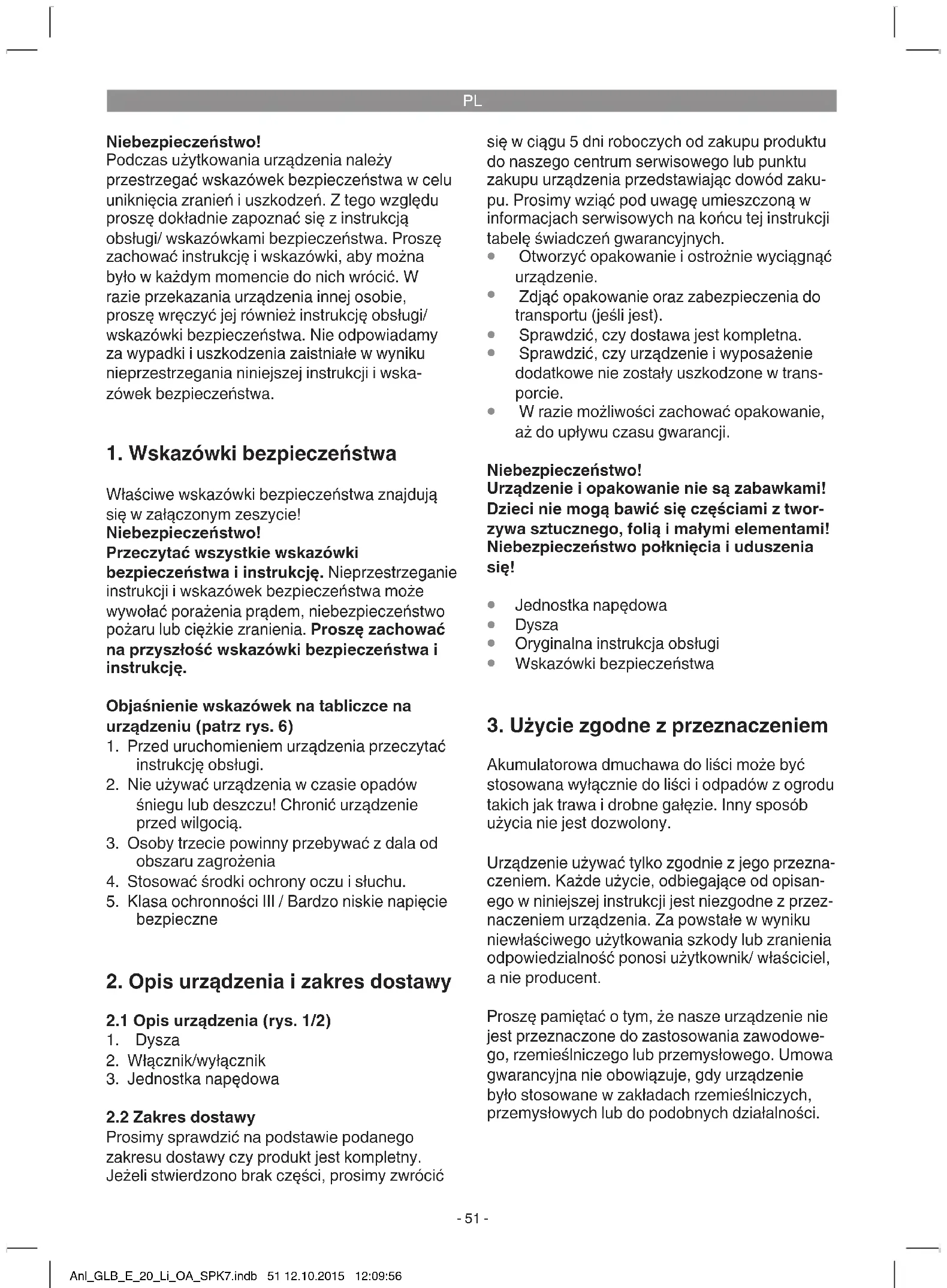 Akumulatorowa dmuchawa do liści może być stosowana wyłącznie do liści i odpadów z ogrodu takich jak trawa i drobne gałęzie. Inny sposób użycia nie jest dozwolony. Urządzenie używać tylko zgodnie z jego przezna- czeniem. Każde użycie, odbiegające od opisan- ego w niniejszej instrukcji jest niezgodne z przez- naczeniem urządzenia. Za powstałe w wyniku niewłaściwego użytkowania szkody lub zranienia odpowiedzialność ponosi użytkownik/ właściciel, a nie producent. Proszę pamiętać o tym, że nasze urządzenie nie jest przeznaczone do zastosowania zawodowe- go, rzemieślniczego lub przemysłowego. Umowa gwarancyjna nie obowiązuje, gdy urządzenie było stosowane w zakładach rzemieślniczych, przemysłowych lub do podobnych działalności. Anl_GLB_E_20_Li_OA_SPK7.indb 51 12.10.2015 12:09:56PL