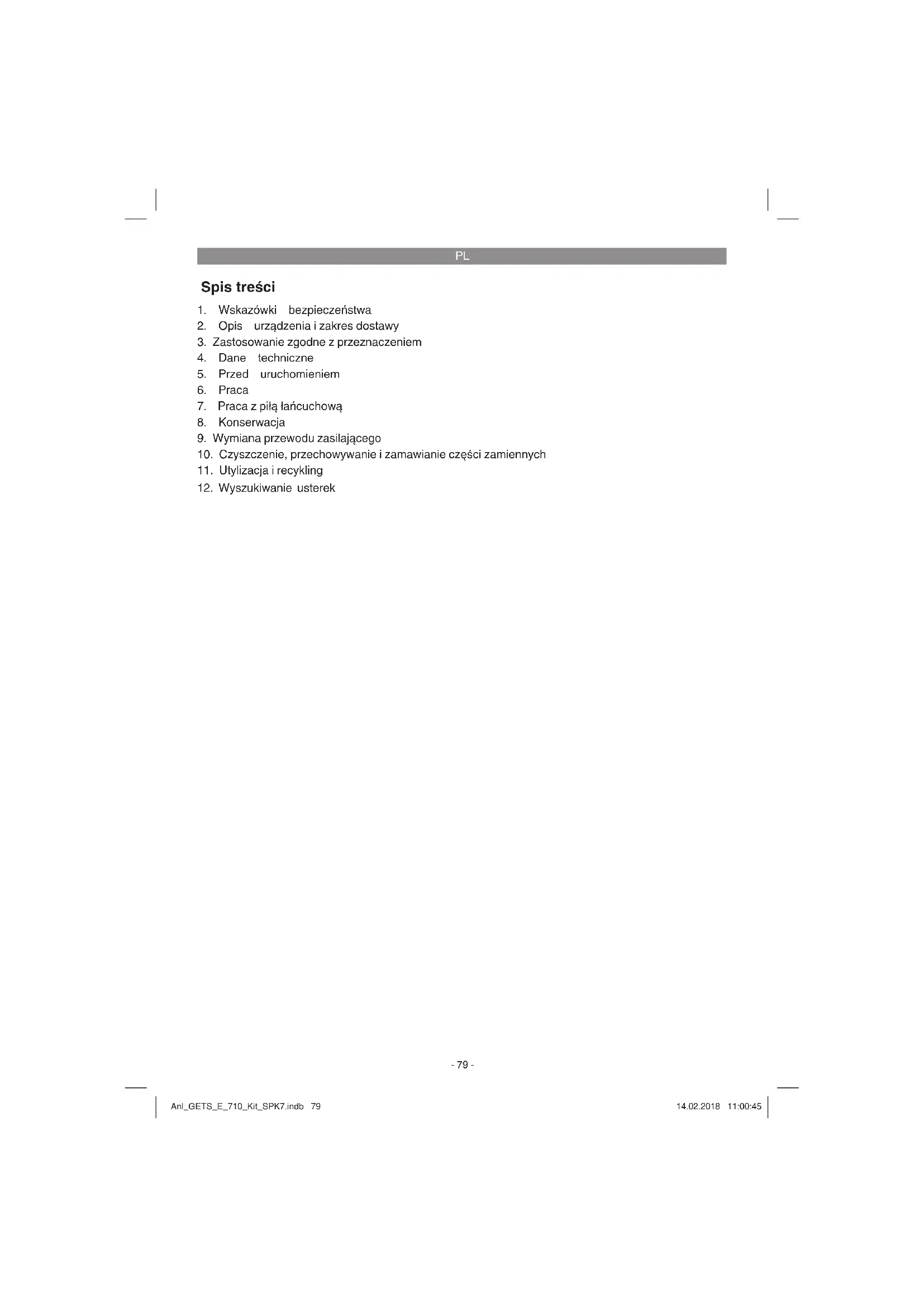 Uwaga! Przed przystąpieniem do kontroli i regu- lacji urządzenia należy zawsze najpierw wyjąć wtyczkę z gniazdka. Aby zapobiec obrażeniom należy zawsze podczas prac na pile łańcuchowej nosić rękawice ochronne. Uwaga! Nigdy nie używać łańcucha bez oleju do łańcuchów pi ł mechanicznych! Używanie piły łańcuchowej bez odpowiedniego oleju lub przy poziomie oleju poniżej wziernika prowadzi do uszkodzeń piły łańcuchowej! Anl_GETS_E_710_Kit_SPK7.indb 82Anl_GETS_E_710_Kit_SPK7.indb 82 14.02.2018 11:00:4614.02.2018 11:00:46PL