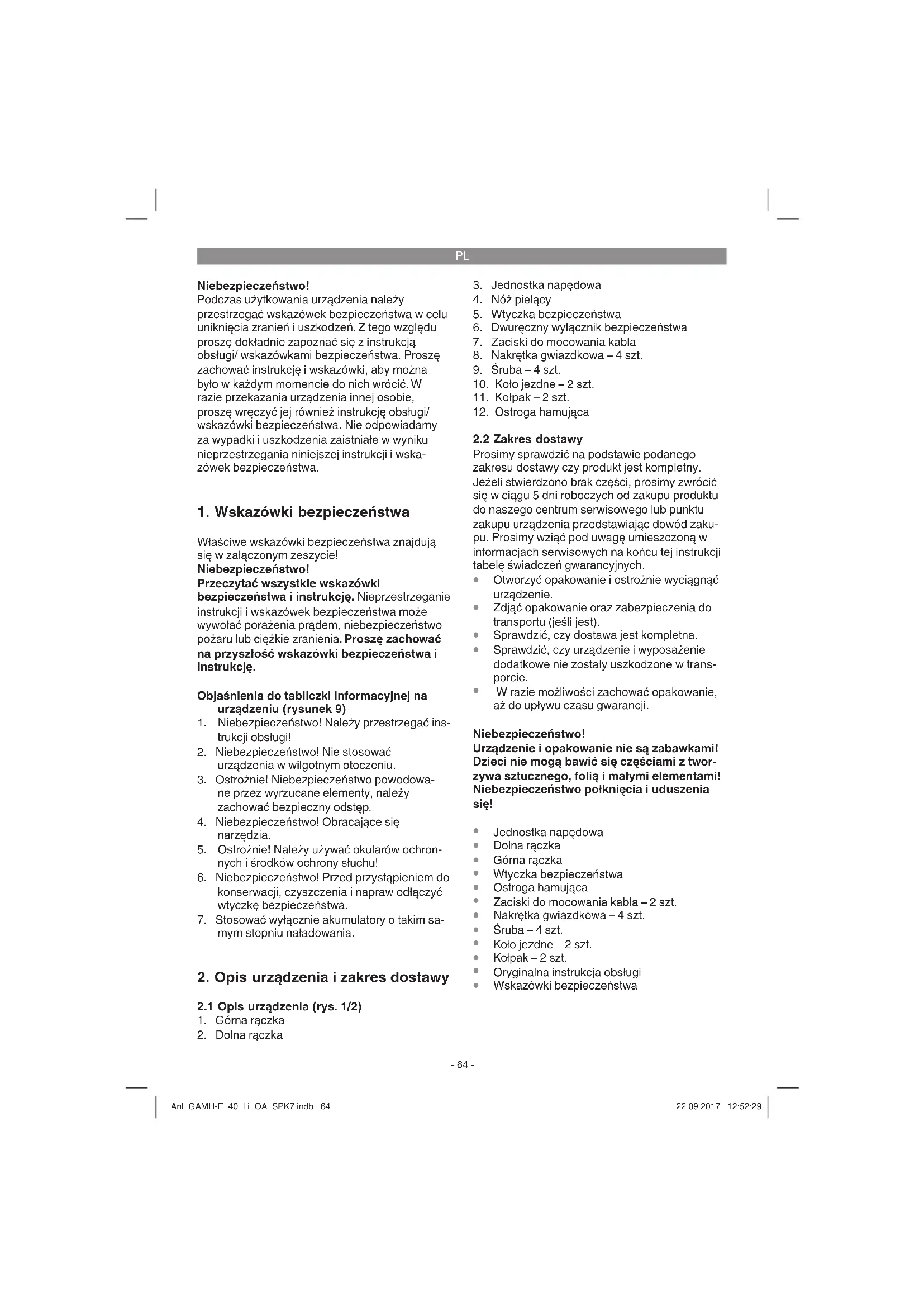 Tylko dla krajów Unii Europejskiej Nie wyrzucać elektronarzędzi do śmieci! Według europejskiej dyrektywy 2012/19/EG o starych urządzeniach elektrycznych i elektronicznych oraz włączenia ich do prawa krajowego, zużyte elektronarzędzia należy zbierać oddzielnie i oddawać do punktu zbiórki surowców wtórnych. Alternatywa recyklingu wobec obowiązku zwrotu urządzenia: Właściciel elektronarzędzi w przypadku przekazania własności, jest zobowiązany, zamiast odesłania, do współudziału we właściwym przetworzeniu. Stare urządzenie może być dostarczone do punktu zbiorczego, który przeprowadza eliminację w myśl krajowego obiegu gospodarczego i ustawy o odpa- dach. Nie dotyczy to osprzętu i środków pomocniczych załączonych do starego urządzenia, które nie mają części elektrycznych. Przedruk lub innego rodzaju powielanie dokumentacji wyrobów oraz dokumentów towarzyszących, na- wet we fragmentach dopuszczalne jest tylko za wyraźną zgodą fi rmy iSC GmbH. Zmiany techniczne zastrzeżone Anl_GAMH-E_40_Li_OA_SPK7.indb 71Anl_GAMH-E_40_Li_OA_SPK7.indb 71 22.09.2017 12:52:3022.09.2017 12:52:30PL