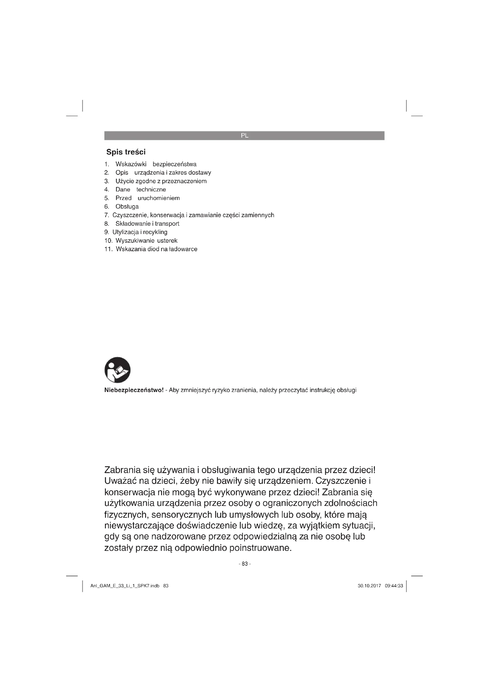 Zabrania się używania i obsługiwania tego urządzenia przez dzieci! Uważać na dzieci, żeby nie bawiły się urządzeniem. Czyszczenie i konserwacja nie mogą być wykonywane przez dzieci! Zabrania się użytkowania urządzenia przez osoby o ograniczonych zdolnościach fi zycznych, sensorycznych lub umysłowych lub osoby, które mają niewystarczające doświadczenie lub wiedzę, za wyjątkiem sytuacji, gdy są one nadzorowane przez odpowiedzialną za nie osobę lub zostały przez nią odpowiednio poinstruowane. Niebezpieczeństwo! - Aby zmniejszyć ryzyko zranienia, należy przeczytać instrukcję obsługi Anl_GAM_E_33_Li_1_SPK7.indb 83Anl_GAM_E_33_Li_1_SPK7.indb 83 30.10.2017 09:44:3330.10.2017 09:44:33PL