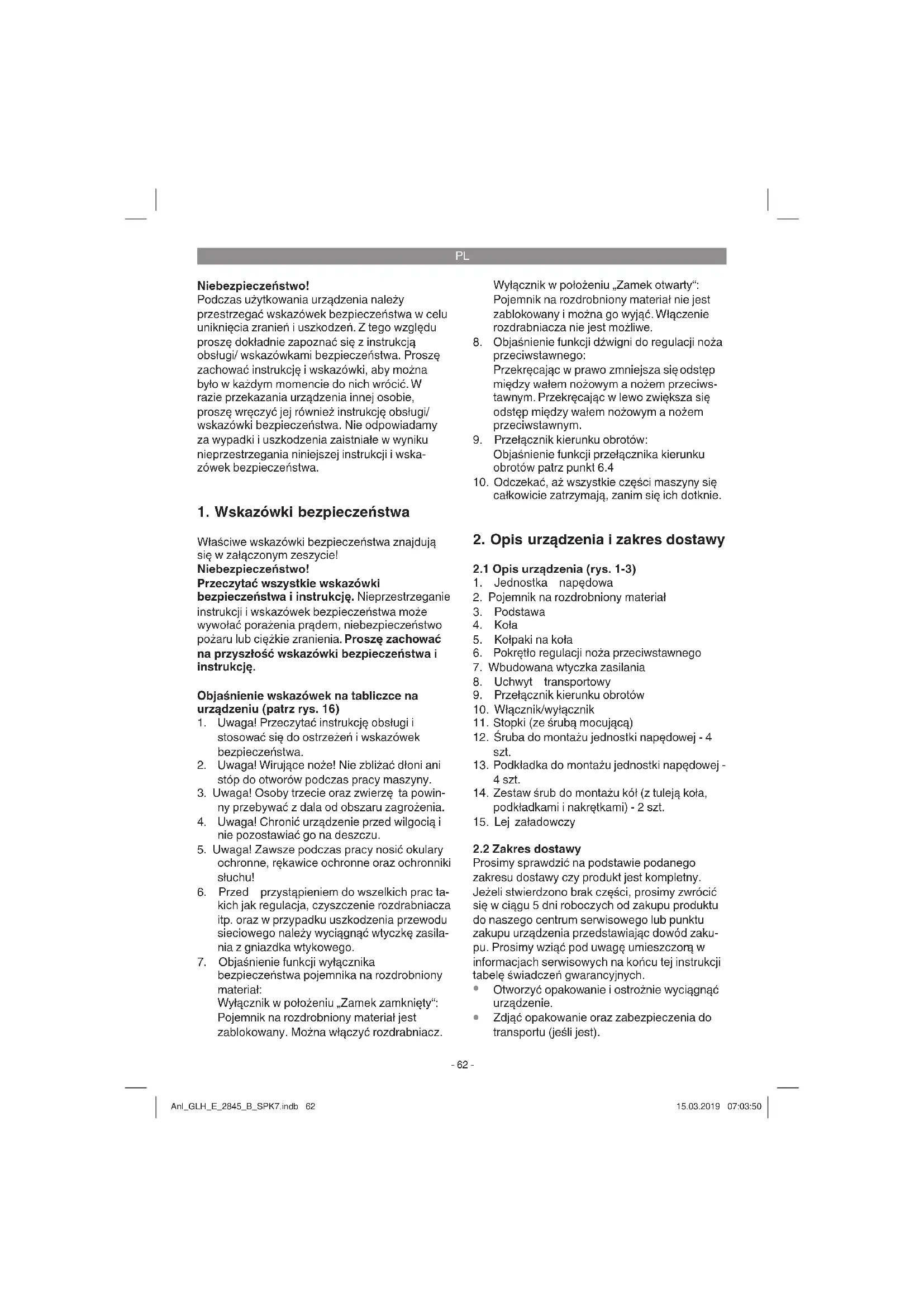drgań ramion i dłoni, w przypadku, gdy urządzenie jest używane przez dłuższy czas lub w niewłaściwy sposób i bez przeglądów. Anl_GLH_E_2845_B_SPK7.indb 63Anl_GLH_E_2845_B_SPK7.indb 63 15.03.2019 07:03:5015.03.2019 07:03:50PL