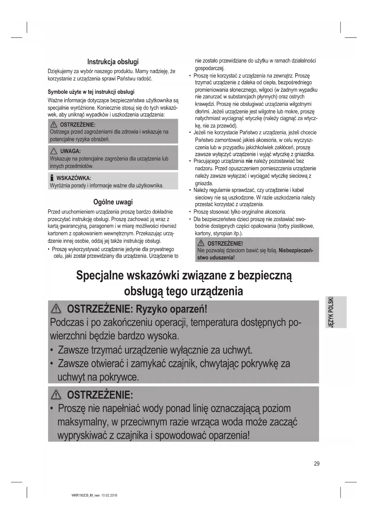 Technical Data Model: ................................................................WKR 1162 CB Power supply:........................................120 / 230 V~, 50 / 60 Hz Power consumption: .....................................................1000 W Protection class: ..................................................................... I Filling quantity: ...................................................0.1 - max. 0.5 l Net weight: .......................................................approx. 0.52 kg The right to make technical and design modications in the course of continuous product development remains reserved. This device has been tested according to all relevant current CE guidelines, such as electromagnetic compatibility and low voltage directives, and has been constructed in accordance with the latest safety regulations. Disposal Meaning of the “Dustbin” Symbol Protect our environment: do not dispose of electrical equipment in the domestic waste. Please return any electrical equipment that you will no longer use to the collection points provid- ed for their disposal. This helps avoid the potential effects of incorrect disposal on the environment and human health. This will contribute to the recycling and other forms of reutili- sation of electrical and electronic equipment. Information concerning where the equipment can be dis- posed of can be obtained from your local authority.29 WKR1162CB_IM_new 10.02.2016 Instrukcja obsługi Dziękujemy za wybór naszego produktu. Mamy nadzieję, że korzystanie z urządzenia sprawi Państwu radość. Symbole użyte w tej instrukcji obsługi Ważne informacje dotyczące bezpieczeństwa użytkownika są specjalnie wyróżnione. Koniecznie stosuj się do tych wskazó- wek, aby uniknąć wypadków i uszkodzenia urządzenia: OSTRZEŻENIE: Ostrzega przed zagrożeniami dla zdrowia i wskazuje na potencjalne ryzyka obrażeń. UWAGA: Wskazuje na potencjalne zagrożenia dla urządzenia lub innych przedmiotów. WSKAZÓWKA: Wyróżnia porady i informacje ważne dla użytkownika. Ogólne uwagi Przed uruchomieniem urządzenia proszę bardzo dokładnie przeczytać instrukcję obsługi. Proszę zachować ją wraz z kartą gwarancyjną, paragonem i w miarę możliwości również kartonem z opakowaniem wewnętrznym. Przekazując urzą- dzenie innej osobie, oddaj jej także instrukcję obsługi.