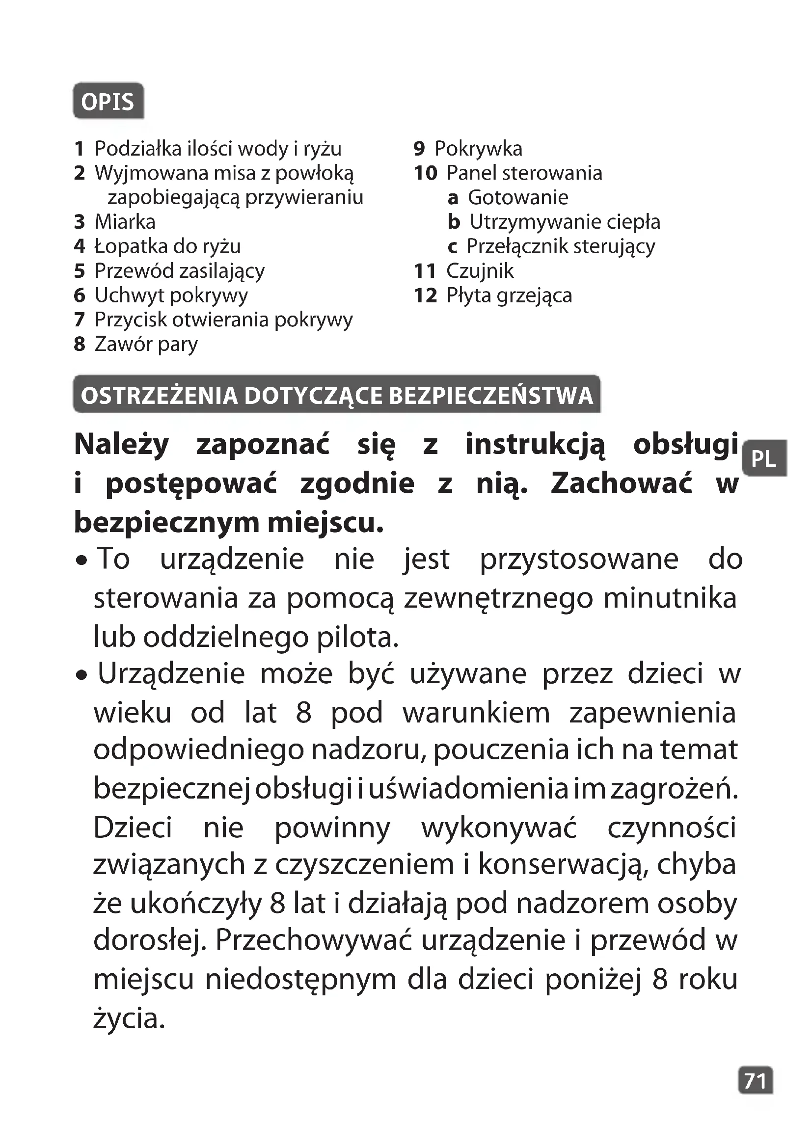 - Urządzenie może być używane przez dzieci w wieku od lat 8 pod warunkiem zapewnienia odpowiedniego nadzoru, pouczenia ich na temat bezpiecznej obsługi i uświadomienia im zagrożeń. Dzieci nie powinny wykonywać czynności związanych z czyszczeniem i konserwacją, chyba że ukończyły 8 lat i działają pod nadzorem osoby dorosłej. Przechowywać urządzenie i przewód w miejscu niedostępnym dla dzieci poniżej 8 roku życia. OPIS 1 Podziałka ilości wody i ryżu 2 Wyjmowana misa z powłoką zapobiegającą przywieraniu 3 Miarka 4 Łopatka do ryżu 5 Przewód zasilający 6 Uchwyt pokrywy 7 Przycisk otwierania pokrywy 8 Zawór pary 9 Pokrywka 10 Panel sterowania a Gotowanie b Utrzymywanie ciepła c Przełącznik sterujący 11 Czujnik 12 Płyta grzejąca7372