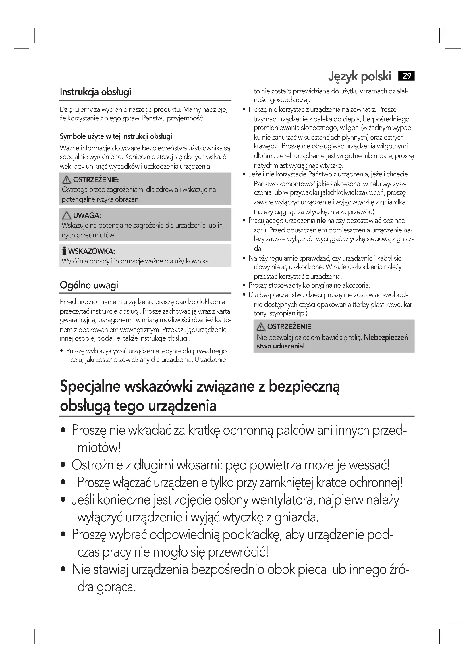- Ostrożnie z długimi włosami: pęd powietrza może je wessać!