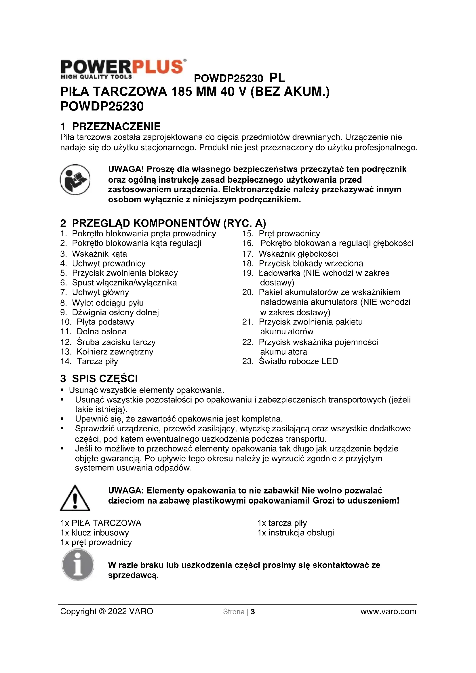 - Jeśli to możliwe to przechować elementy opakowania tak długo jak urządzenie będzie objęte gwarancją. Po upływie tego okresu należy je wyrzucić zgodnie z przyjętym systemem usuwania odpadów. UWAGA: Elementy opakowania to nie zabawki! Nie wolno pozwalać dzieciom na zabawę plastikowymi opakowaniami! Grozi to uduszeniem! 1x PIŁA TARCZOWA 1x klucz inbusowy 1x pręt prowadnicy 1x tarcza piły 1x instrukcja obsługi W razie braku lub uszkodzenia części prosimy się skontaktować ze sprzedawcą.POWDP25230 PL Copyright © 2022 VARO Strona | 4 www.varo.com 4 SYMBOLE W niniejszej instrukcji i na urządzeniu zastosowano następujące symbole: