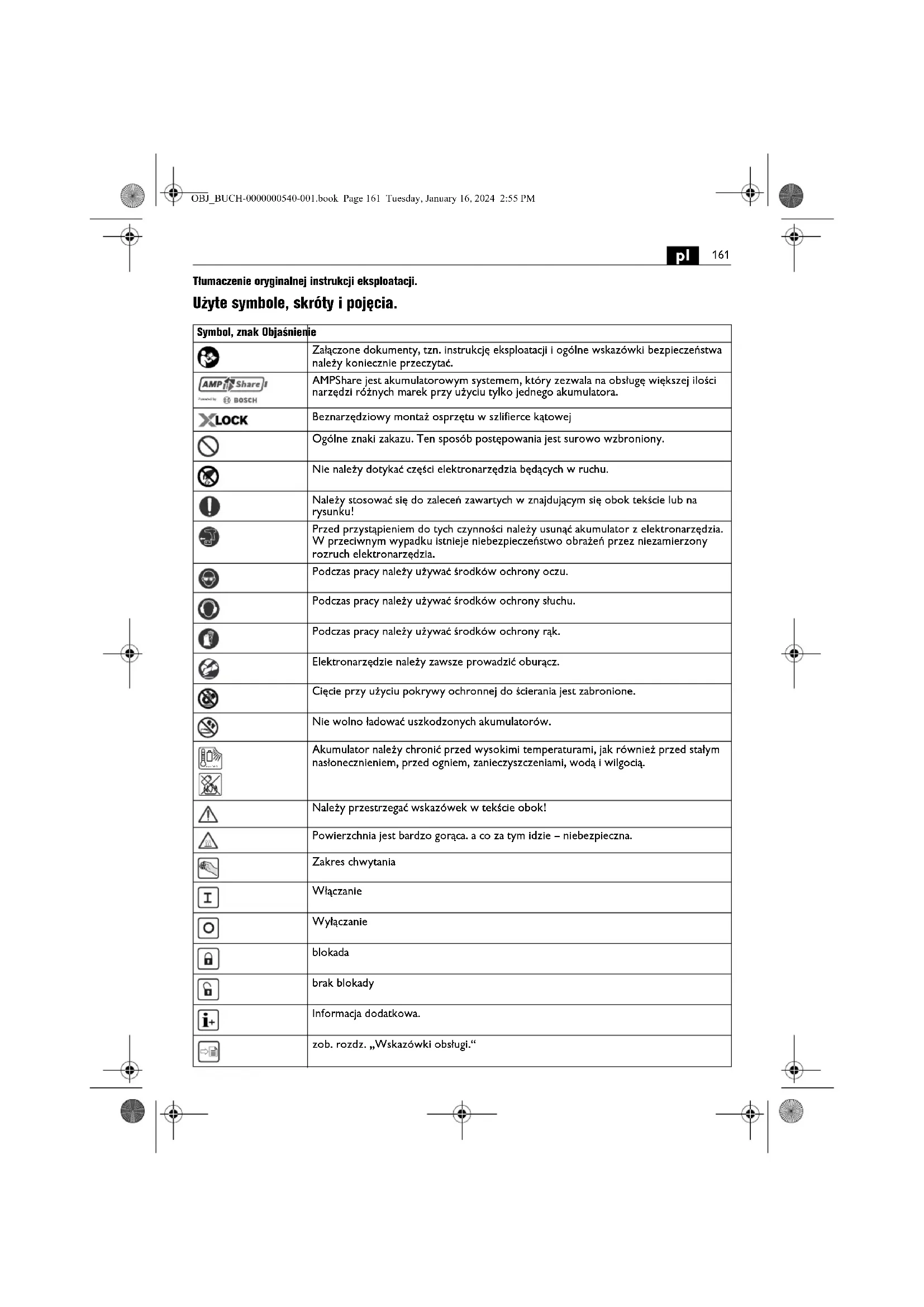 Tłumaczenie oryginalnej instrukcji eksploatacji. Użyte symbole, skróty i pojęcia. Symbol, znak Objaśnienie Załączone dokumenty, tzn. instrukcję eksploatacji i ogólne wskazówki bezpieczeństwa należy koniecznie przeczytać. AMPShare jest akumulatorowym systemem, który zezwala na obsługę większej ilości narzędzi różnych marek przy użyciu tylko jednego akumulatora. Beznarzędziowy montaż osprzętu w szlifierce kątowej Ogólne znaki zakazu. Ten sposób postępowania jest surowo wzbroniony. Nie należy dotykać części elektronarzędzia będących w ruchu. Należy stosować się do zaleceń zawartych w znajdującym się obok tekście lub na rysunku! Przed przystąpieniem do tych czynności należy usunąć akumulator z elektronarzędzia. W przeciwnym wypadku istnieje niebezpieczeństwo obrażeń przez niezamierzony rozruch elektronarzędzia. Podczas pracy należy używać środków ochrony oczu. Podczas pracy należy używać środków ochrony słuchu. Podczas pracy należy używać środków ochrony rąk. Elektronarzędzie należy zawsze prowadzić oburącz. Cięcie przy użyciu pokrywy ochronnej do ścierania jest zabronione. Nie wolno ładować uszkodzonych akumulatorów. Akumulator należy chronić przed wysokimi temperaturami, jak również przed stałym nasłonecznieniem, przed ogniem, zanieczyszczeniami, wodą i wilgocią. Należy przestrzegać wskazówek w tekście obok! Powierzchnia jest bardzo gorąca. a co za tym idzie – niebezpieczna. Zakres chwytania Włączanie Wyłączanie blokada brak blokady Informacja dodatkowa. zob. rozdz. „Wskazówki obsługi.“ max.50°C OBJ_BUCH-0000000540-001.book Page 161 Tuesday, January 16, 2024 2:55 PM162