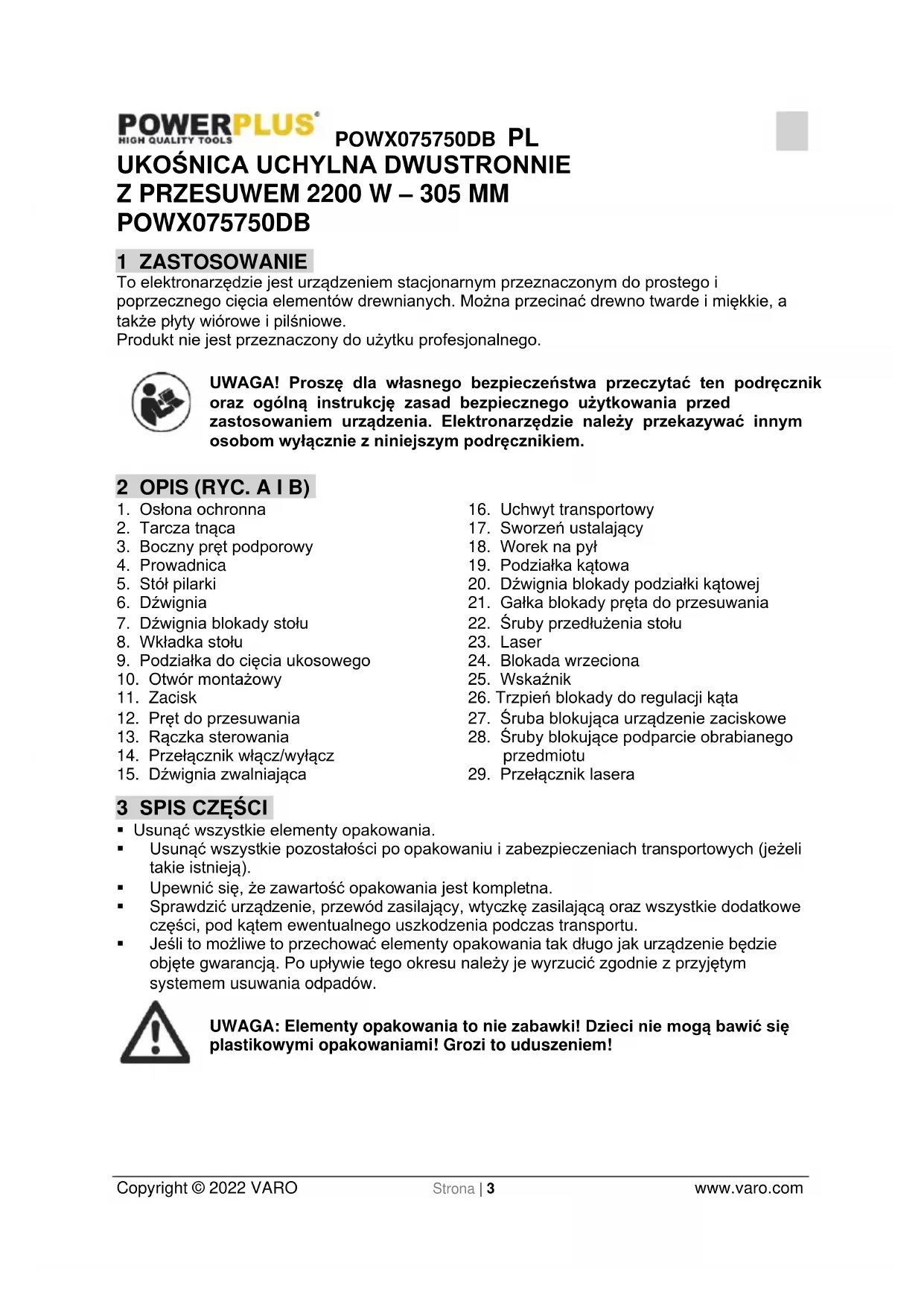 POWX075750DB 1 ZASTOSOWANIE To elektronarzędzie jest urządzeniem stacjonarnym przeznaczonym do prostego i poprzecznego cięcia elementów drewnianych. Można przecinać drewno twarde i miękkie, a także płyty wiórowe i pilśniowe. Produkt nie jest przeznaczony do użytku profesjonalnego. UWAGA! Proszę dla własnego bezpieczeństwa przeczytać ten podręcznik oraz ogólną instrukcję zasad bezpiecznego użytkowania przed zastosowaniem urządzenia. Elektronarzędzie należy przekazywać innym osobom wyłącznie z niniejszym podręcznikiem. 2 OPIS (RYC. A I B)