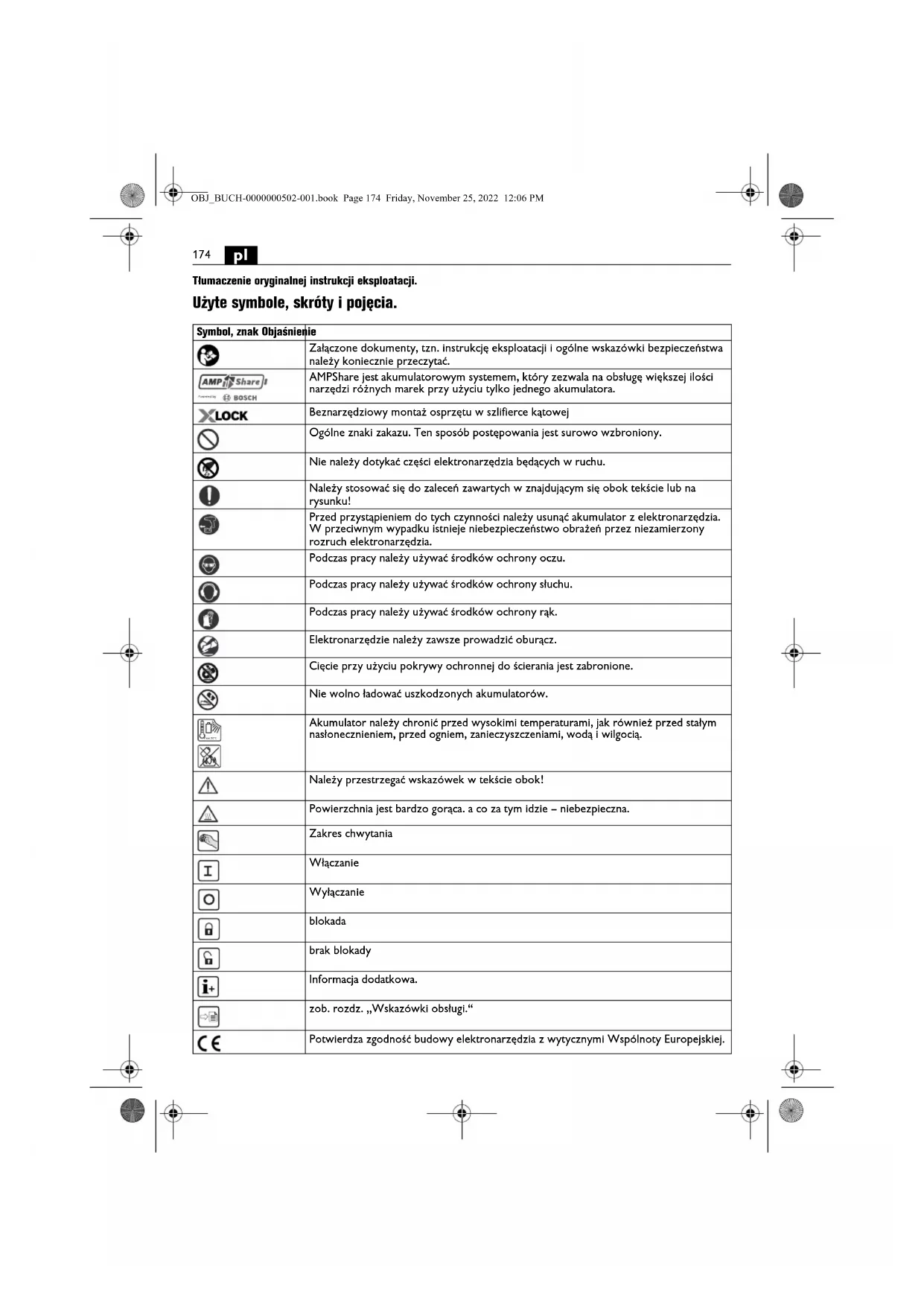 Tłumaczenie oryginalnej instrukcji eksploatacji. Użyte symbole, skróty i pojęcia. Symbol, znak Objaśnienie Załączone dokumenty, tzn. instrukcję eksploatacji i ogólne wskazówki bezpieczeństwa należy koniecznie przeczytać. AMPShare jest akumulatorowym systemem, który zezwala na obsługę większej ilości narzędzi różnych marek przy użyciu tylko jednego akumulatora. Beznarzędziowy montaż osprzętu w szlifierce kątowej Ogólne znaki zakazu. Ten sposób postępowania jest surowo wzbroniony. Nie należy dotykać części elektronarzędzia będących w ruchu. Należy stosować się do zaleceń zawartych w znajdującym się obok tekście lub na rysunku! Przed przystąpieniem do tych czynności należy usunąć akumulator z elektronarzędzia. W przeciwnym wypadku istnieje niebezpieczeństwo obrażeń przez niezamierzony rozruch elektronarzędzia. Podczas pracy należy używać środków ochrony oczu. Podczas pracy należy używać środków ochrony słuchu. Podczas pracy należy używać środków ochrony rąk. Elektronarzędzie należy zawsze prowadzić oburącz. Cięcie przy użyciu pokrywy ochronnej do ścierania jest zabronione. Nie wolno ładować uszkodzonych akumulatorów. Akumulator należy chronić przed wysokimi temperaturami, jak również przed stałym nasłonecznieniem, przed ogniem, zanieczyszczeniami, wodą i wilgocią. Należy przestrzegać wskazówek w tekście obok! Powierzchnia jest bardzo gorąca. a co za tym idzie – niebezpieczna. Zakres chwytania Włączanie Wyłączanie blokada brak blokady Informacja dodatkowa. zob. rozdz. „Wskazówki obsługi.“ Potwierdza zgodność budowy elektronarzędzia z wytycznymi Wspólnoty Europejskiej. max.50°C OBJ_BUCH-0000000502-001.book Page 174 Friday, November 25, 2022 12:06 PM175