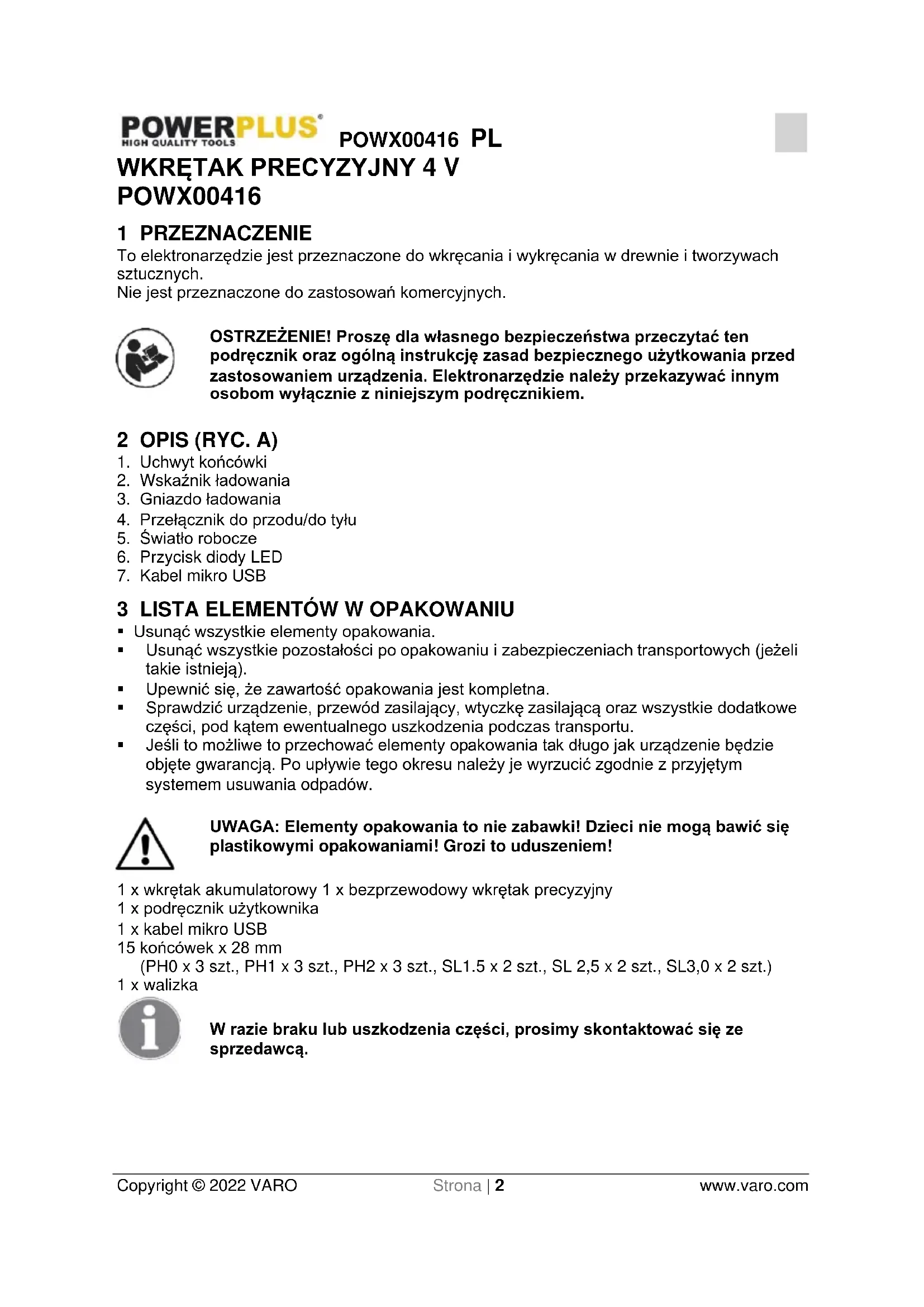 - Jeśli to możliwe to przechować elementy opakowania tak długo jak urządzenie będzie objęte gwarancją. Po upływie tego okresu należy je wyrzucić zgodnie z przyjętym systemem usuwania odpadów. UWAGA: Elementy opakowania to nie zabawki! Dzieci nie mogą bawić się plastikowymi opakowaniami! Grozi to uduszeniem! 1 x wkrętak akumulatorowy 1 x bezprzewodowy wkrętak precyzyjny 1 x podręcznik użytkownika 1 x kabel mikro USB 15 końcówek x 28 mm (PH0 x 3 szt., PH1 x 3 szt., PH2 x 3 szt., SL1.5 x 2 szt., SL 2,5 x 2 szt., SL3,0 x 2 szt.) 1 x walizka W razie braku lub uszkodzenia części, prosimy skontaktować się ze sprzedawcą.POWX00416 PL Copyright © 2022 VARO Strona | 3 www.varo.com 4 SYMBOLE W niniejszej instrukcji i na urządzeniu zastosowano następujące symbole: