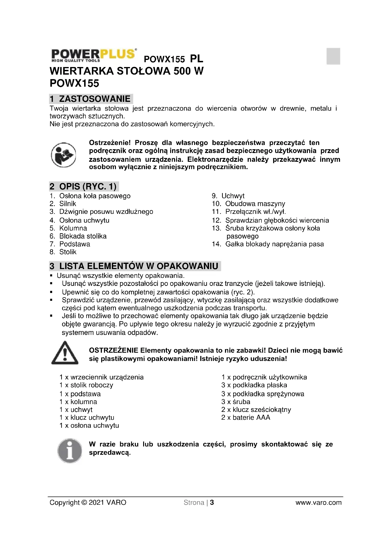 - Jeśli to możliwe to przechować elementy opakowania tak długo jak urządzenie będzie objęte gwarancją. Po upływie tego okresu należy je wyrzucić zgodnie z przyjętym systemem usuwania odpadów. OSTRZEŻENIE Elementy opakowania to nie zabawki! Dzieci nie mogą bawić się plastikowymi opakowaniami! Istnieje ryzyko uduszenia! 1 x wrzeciennik urządzenia 1 x stolik roboczy 1 x podstawa 1 x kolumna 1 x uchwyt 1 x klucz uchwytu 1 x osłona uchwytu 1 x podręcznik użytkownika 3 x podkładka płaska 3 x podkładka sprężynowa 3 x śruba 2 x klucz sześciokątny 2 x baterie AAA W razie braku lub uszkodzenia części, prosimy skontaktować się ze sprzedawcą.POWX155 PL Copyright © 2021 VARO Strona | 4 www.varo.com 4 SYMBOLE W niniejszej instrukcji i na urządzeniu zastosowano następujące symbole: