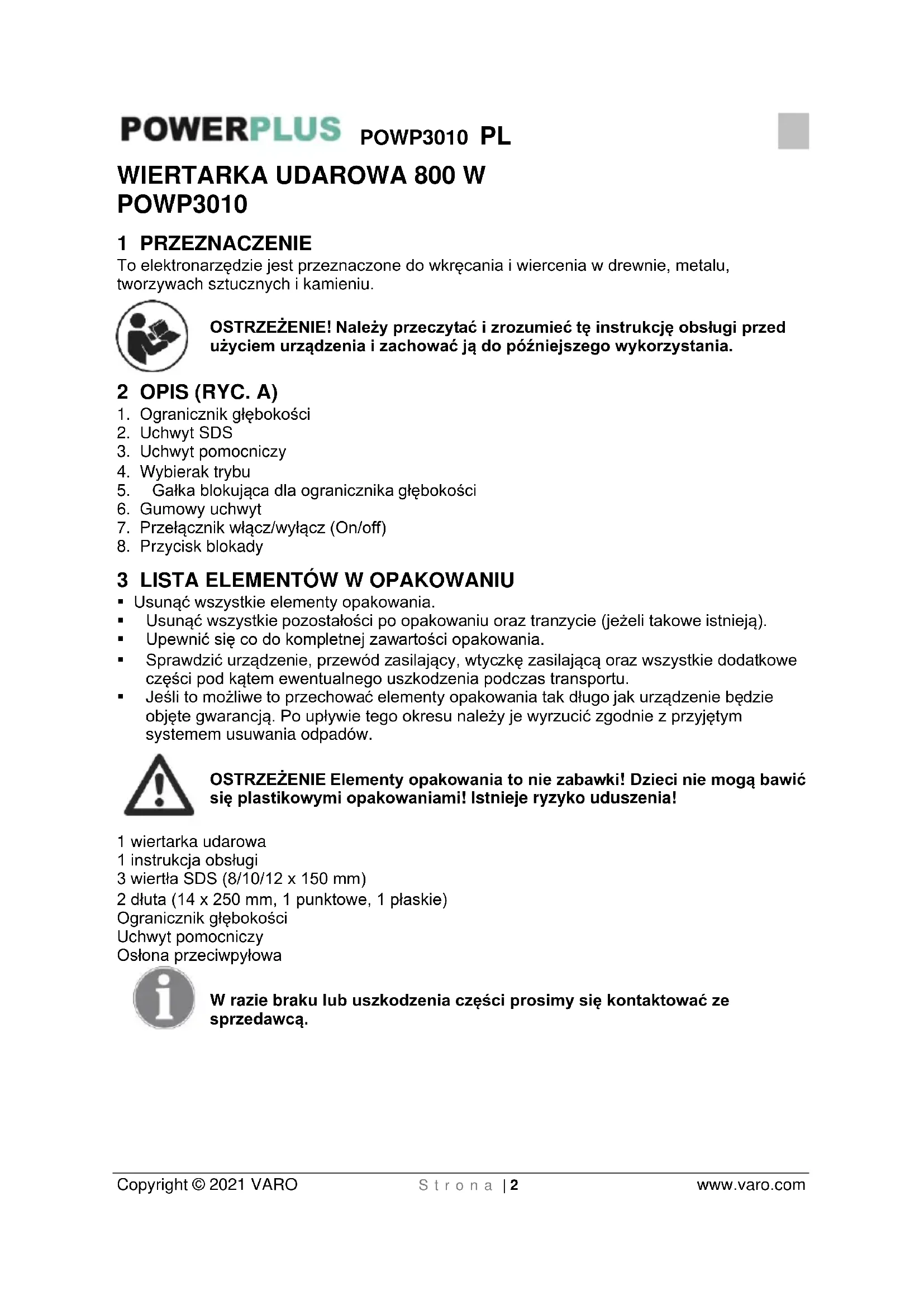 - Jeśli to możliwe to przechować elementy opakowania tak długo jak urządzenie będzie objęte gwarancją. Po upływie tego okresu należy je wyrzucić zgodnie z przyjętym systemem usuwania odpadów. OSTRZEŻENIE Elementy opakowania to nie zabawki! Dzieci nie mogą bawić się plastikowymi opakowaniami! Istnieje ryzyko uduszenia! 1 wiertarka udarowa 1 instrukcja obsługi 3 wiertła SDS (8/10/12 x 150 mm) 2 dłuta (14 x 250 mm, 1 punktowe, 1 płaskie) Ogranicznik głębokości Uchwyt pomocniczy Osłona przeciwpyłowa W razie braku lub uszkodzenia części prosimy się kontaktować ze sprzedawcą.POWP3010 PL Copyright © 2021 VARO S t r o n a | 3 www.varo.com