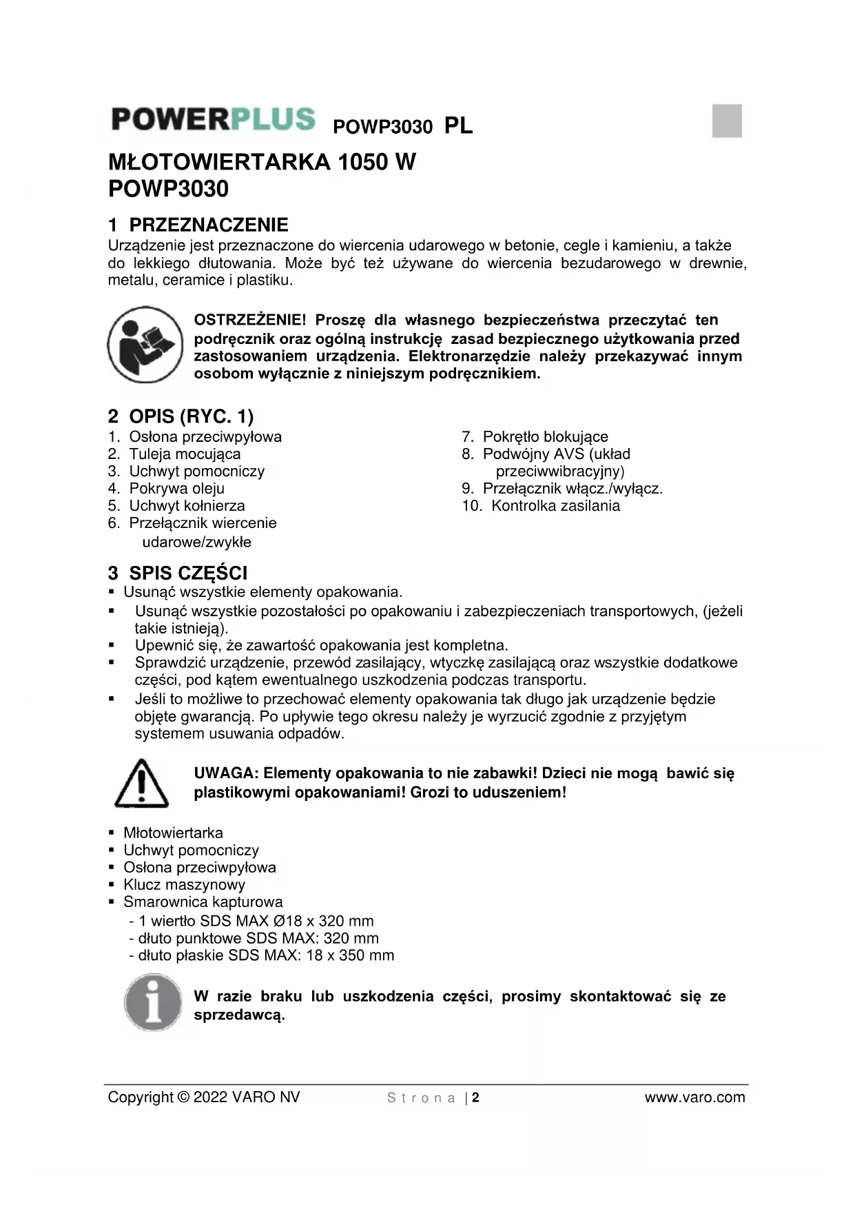 - Niezdemontowane narzędzie należy zwrócić do sprzedawcy w oryginalnej plastikowej walizce (jeżeli produkt był w nią fabrycznie zapakowany) wraz z dowodem zakupu. 15 ŚRODOWISKO NATURALNE Jeśli konieczna będzie wymiana urządzenia po jego długim użytkowaniu, nie wolno go wyrzucać z normalnymi odpadami z gospodarstwa domowego, ale należy się go pozbyć w sposób bezpieczny dla środowiska. Zużyte urządzenia elektryczne nie mogą być traktowane jak zwykłe odpady domowe. Należy je odstawić do wyspecjalizowanych punktów zbiórki takich odpadów. Informacje na temat recyklingu i pozbywania się odpadów można uzyskać od administracji lokalnej lub od sprzedawcy.POWP3030 PL Copyright © 2022 VARO NV S t r o n a | 10 www.varo.com