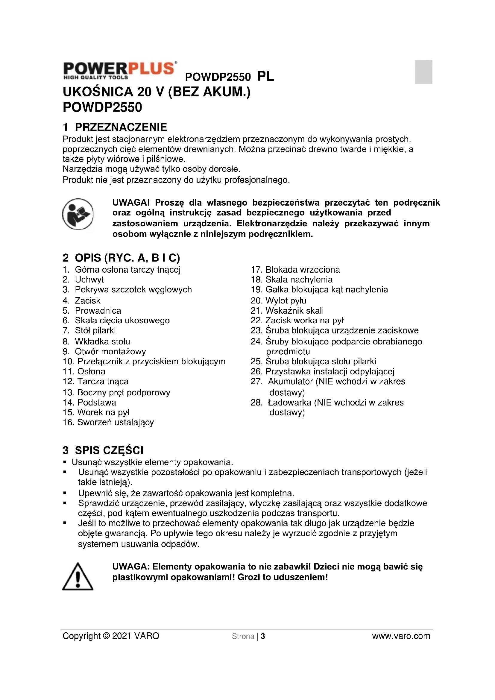 Copyright © 2021 VARO Strona | 3 www.varo.com UKOŚNICA 20 V (BEZ AKUM.) POWDP2550 1 PRZEZNACZENIE Produkt jest stacjonarnym elektronarzędziem przeznaczonym do wykonywania prostych, poprzecznych cięć elementów drewnianych. Można przecinać drewno twarde i miękkie, a także płyty wiórowe i pilśniowe. Narzędzia mogą używać tylko osoby dorosłe. Produkt nie jest przeznaczony do użytku profesjonalnego. UWAGA! Proszę dla własnego bezpieczeństwa przeczytać ten podręcznik oraz ogólną instrukcję zasad bezpiecznego użytkowania przed zastosowaniem urządzenia. Elektronarzędzie należy przekazywać innym osobom wyłącznie z niniejszym podręcznikiem. 2 OPIS (RYC. A, B I C)