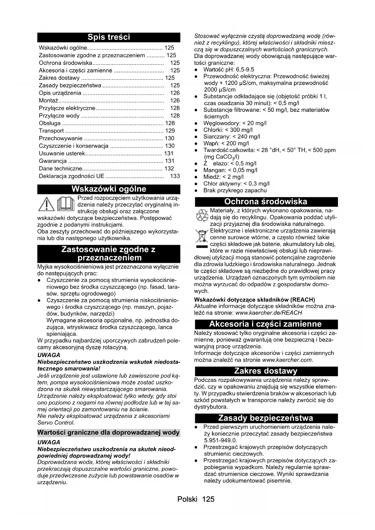 • /l) ●Żelazo: < 0,5 mg/l ● Mangan: < 0,05 mg/l ● Miedź: < 2 mg/l ● Chlor aktywny: < 0,3 mg/l ● Brak przykrego zapachu Ochrona środowiska Materiały, z których wykonano opakowania, na- dają się do recyklingu. Opakowania poddać utyli- zacji przyjaznej dla środowiska naturalnego. Elektryczne i elektroniczne urządzenia zawierają cenne surowce wtórne, a często również takie części składowe jak baterie, akumulatory lub olej, które w razie niewłaściwej obsługi lub nieprawi- dłowej utylizacji mogą stanowić potencjalne zagrożenie dla zdrowia ludzkiego i środowiska naturalnego. Jednak te części składowe są niezbędne do prawidłowej pracy urządzenia. Urządzeń oznaczonych tym symbolem nie można wyrzucać do odpadów z gospodarstw domo- wych. Wskazówki dotyczące składników (REACH) Aktualne informacje dotyczące składników można zna- leźć na stronie: www.kaercher.de/REACH Akcesoria i części zamienne Należy stosować tylko oryginalne akcesoria i części za- mienne, ponieważ gwarantują one bezpieczną i beza- waryjną pracę urządzenia. Informacje dotyczące akcesoriów i części zamiennych można znaleźć na stronie www.kaercher.com. Zakres dostawy Podczas rozpakowywania urządzenia należy spraw- dzić, czy w opakowaniu znajdują się wszystkie elemen- ty. W przypadku stwierdzenia braków w akcesoriach lub szkód powstałych w transporcie należy zwrócić się do dystrybutora. Zasady bezpieczeństwa ● Przed pierwszym uruchomieniem urządzenia nale- ży koniecznie przeczytać zasady bezpieczeństwa 5.951-949.0. ● Przestrzegać krajowych przepisów dotyczących strumienic cieczowych. ● Przestrzegać krajowych przepisów dotyczących za- pobiegania wypadkom. Należy regularnie spraw- dzać strumienice cieczowe. Wyniki sprawdzania należy udokumentować pisemnie. Wskazówki ogólne p. 125