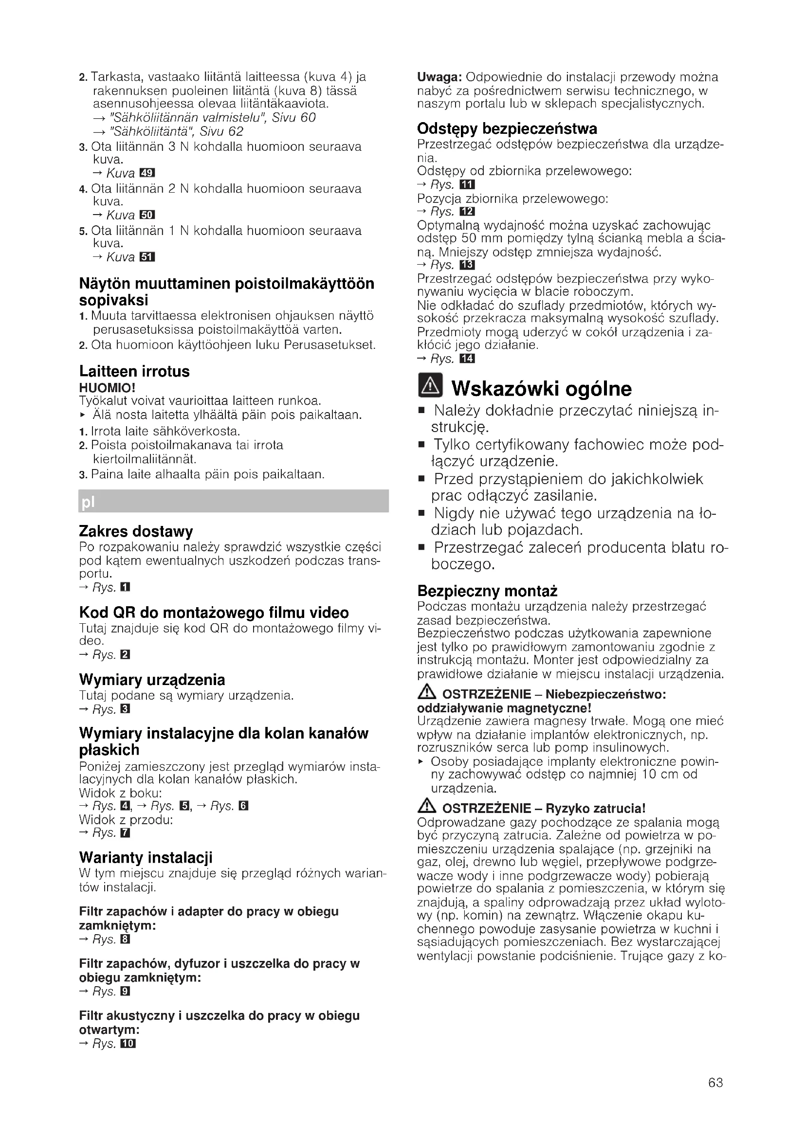 Wskazówki ogólne ¡ Należy dokładnie przeczytać niniejszą in- strukcję. ¡ Tylko certyfikowany fachowiec może pod- łączyć urządzenie. ¡ Przed przystąpieniem do jakichkolwiek prac odłączyć zasilanie. ¡ Nigdy nie używać tego urządzenia na ło- dziach lub pojazdach. ¡ Przestrzegać zaleceń producenta blatu ro- boczego. Bezpieczny montaż Podczas montażu urządzenia należy przestrzegać zasad bezpieczeństwa. Bezpieczeństwo podczas użytkowania zapewnione jest tylko po prawidłowym zamontowaniu zgodnie z instrukcją montażu. Monter jest odpowiedzialny za prawidłowe działanie w miejscu instalacji urządzenia. OSTRZEŻENIE‒Niebezpieczeństwo: oddziaływanie magnetyczne! Urządzenie zawiera magnesy trwałe. Mogą one mieć wpływ na działanie implantów elektronicznych, np. rozruszników serca lub pomp insulinowych. ▶ Osoby posiadające implanty elektroniczne powin- ny zachowywać odstęp co najmniej 10cm od urządzenia. OSTRZEŻENIE‒Ryzyko zatrucia! Odprowadzane gazy pochodzące ze spalania mogą być przyczyną zatrucia. Zależne od powietrza w po- mieszczeniu urządzenia spalające (np. grzejniki na gaz, olej, drewno lub węgiel, przepływowe podgrze- wacze wody i inne podgrzewacze wody) pobierają powietrze do spalania z pomieszczenia, w którym się znajdują, a spaliny odprowadzają przez układ wyloto- wy (np. komin) na zewnątrz. Włączenie okapu ku- chennego powoduje zasysanie powietrza w kuchni i sąsiadujących pomieszczeniach. Bez wystarczającej wentylacji powstanie podciśnienie. Trujące gazy z ko-64 mina lub ciągu wentylacyjnego uwalniane będą do pomieszczeń mieszkalnych. ▶ Należy zadbać o dostateczną ilość doprowadza- nego powietrza, jeżeli urządzenie pracujące w try- bie obiegu otwartego jest użytkowane jednocze- śnie z zależnym od dopływu powietrza urządze- niem spalającym. ▶ Praca bez zagrożeń możliwa jest, jeśli w miejscu ustawienia urządzenia spalającego nie zostanie przekroczone podciśnienie 4 Pa (0,04 mbara). Ta- ką wartość można osiągnąć, jeśli powietrze po- trzebne do spalania będzie dostarczane przez otwory niezamykane na stałe, np. drzwi, okna, wy- wietrzniki ścienne lub za pomocą innych środków technicznych. Sam wywietrznik ścienny nie zapew- nia utrzymania wartości granicznej. ▶ Należy zasięgnąć porady kominiarza, który może ocenić instalację wentylacyjną budynku i zapropo- nować odpowiednie rozwiązanie w zakresie wenty- lacji. ▶ Jeżeli urządzenie użytkowane jest wyłącznie w try- bie obiegu zamkniętego, może być stosowane bez ograniczeń. OSTRZEŻENIE‒Ryzyko pożaru! Osad z tłuszczu w filtrze przeciwtłuszczowym może się zapalić. ▶ Nie używać w pobliżu urządzenia źródeł otwartego ognia (np. przy flambirowaniu). ▶ Urządzenie można zainstalować w pobliżu pieca opalanego paliwem stałym (np. drewnem lub wę- glem) tylko wtedy, gdy występuje zamknięta, za- mocowana na stałe osłona ochronna. Nie może dochodzić do iskrzenia. OSTRZEŻENIE‒Ryzyko odniesienia obrażeń! Wszelkie zmiany i modyfikacje w zakresie układu elektrycznego lub konstrukcji mechanicznej są nie- bezpieczne i mogą być przyczyną nieprawidłowego działania urządzenia. ▶ Nie dokonywać żadnych zmian w zakresie układu elektrycznego lub konstrukcji mechanicznej. Części, które są dostępne podczas montażu, mogą mieć ostre krawędzie i powodować skaleczenia. ▶ Nosić rękawice ochronne. Urządzenie jest ciężkie. ▶ Do przenoszenia urządzenia potrzebne są 2 oso- by. ▶ Używać wyłącznie odpowiednich narzędzi pomoc- niczych. OSTRZEŻENIE‒Ryzyko uduszenia się! Dzieci mogą sobie naciągnąć materiały opakowania na głowę lub zawinąć się w nie i udusić się. ▶ Materiały z opakowania należy trzymać poza za- sięgiem dzieci. ▶ Nie pozwalać dzieciom na zabawę opakowaniem, aszczególnie folią. OSTRZEŻENIE‒Ryzyko zatrucia! Zasysane z powrotem gazy spalinowe mogą prowa- dzić do zatruć. ▶ Nie odprowadzać powietrza wylotowego do pracu- jącego komina dymowego lub komina spalinowe- go. ▶ Nie odprowadzać powietrza wylotowego do szybu, który służy do odpowietrzania pomieszczeń komin- kami. ▶ Jeżeli powietrze wylotowe ma być odprowadzane do komina dymowego lub komina spalinowego, który nie pracuje, trzeba mieć na to zgodę od od- powiedniego mistrza kominiarskiego. Odprowadzane gazy pochodzące ze spalania mogą być przyczyną zatrucia. ▶ Jeżeli okap kuchenny jest zainstalowany z komin- kiem zależnym od powietrza w pomieszczeniu, za- silanie elektryczne okapu kuchennego musi być wyposażone w odpowiedni obwód zabezpieczają- cy. Wskazówki dotyczące przyłącza elektrycznego Aby móc bezpiecznie podłączyć urządzenie do sieci elektrycznej, należy przestrzegać poniższych wskazó- wek. OSTRZEŻENIE‒Ryzyko porażenia prądem! Odłączenie urządzenia od zasilania musi być możli- we w każdej chwili. Urządzenie można podłączyć wy- łącznie do gniazda zainstalowanego zgodnie z prze- pisami. ▶ Jeśli nie jest to możliwe, w stałej instalacji elek- trycznej należy zamontować rozłącznik wielobiegu- nowy zgodnie z warunkami kategorii przepięciowej III i przepisami instalacyjnymi. ▶ Jedynie osoba z uprawnieniami elektryka może wykonać stałą instalację elektryczną. Zalecamy za- instalowanie wyłącznika różnicowo-prądowego (wyłącznik RP) w obwodzie elektrycznym zasilania urządzenia. ¡ Nie zaginać ani nie zaciskać przewodu przyłącze- niowego i trzymać go z dala od ostrych krawędzi. ¡ Ułożyć kabel przyłączeniowy tak, aby nie dotykał gorącej obudowy urządzenia. ¡ Używać wyłącznie przewodu przyłączeniowego do- starczonego wraz z urządzeniem lub przewodu do- starczonego przez serwisanta. ¡ To urządzenie spełnia wymogi zarządzeń WE w sprawie układów przeciwzakłóceniowych. ¡ Urządzenie odpowiada klasie ochrony 1. Dlatego może być użytkowane wyłącznie, jeś