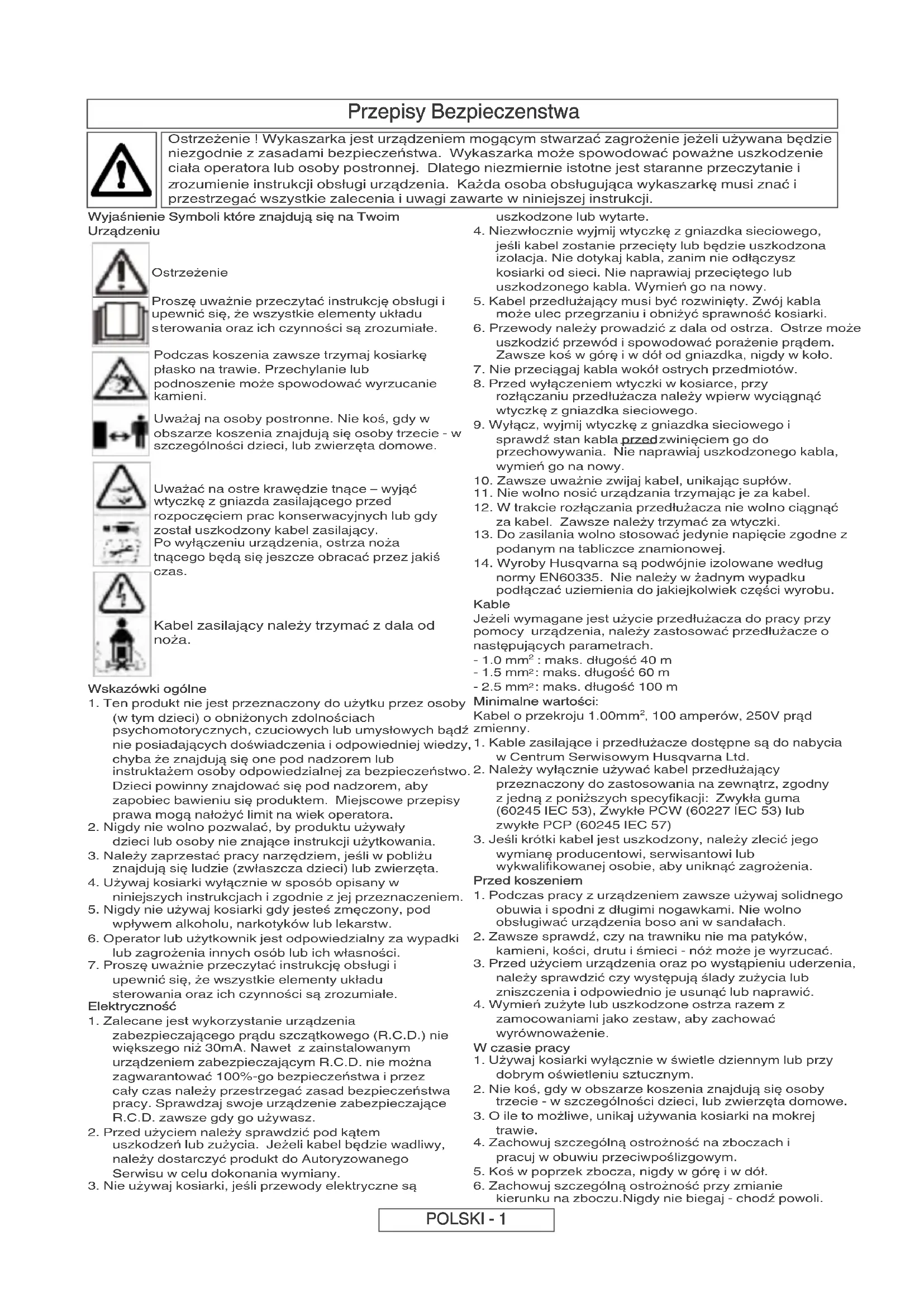 jeśli kabel zostanie przecięty lub będzie uszkodzona izolacja. Nie dotykaj kabla, zanim nie odłączysz kosiarki od sieci. Nie naprawiaj przeciętego lub