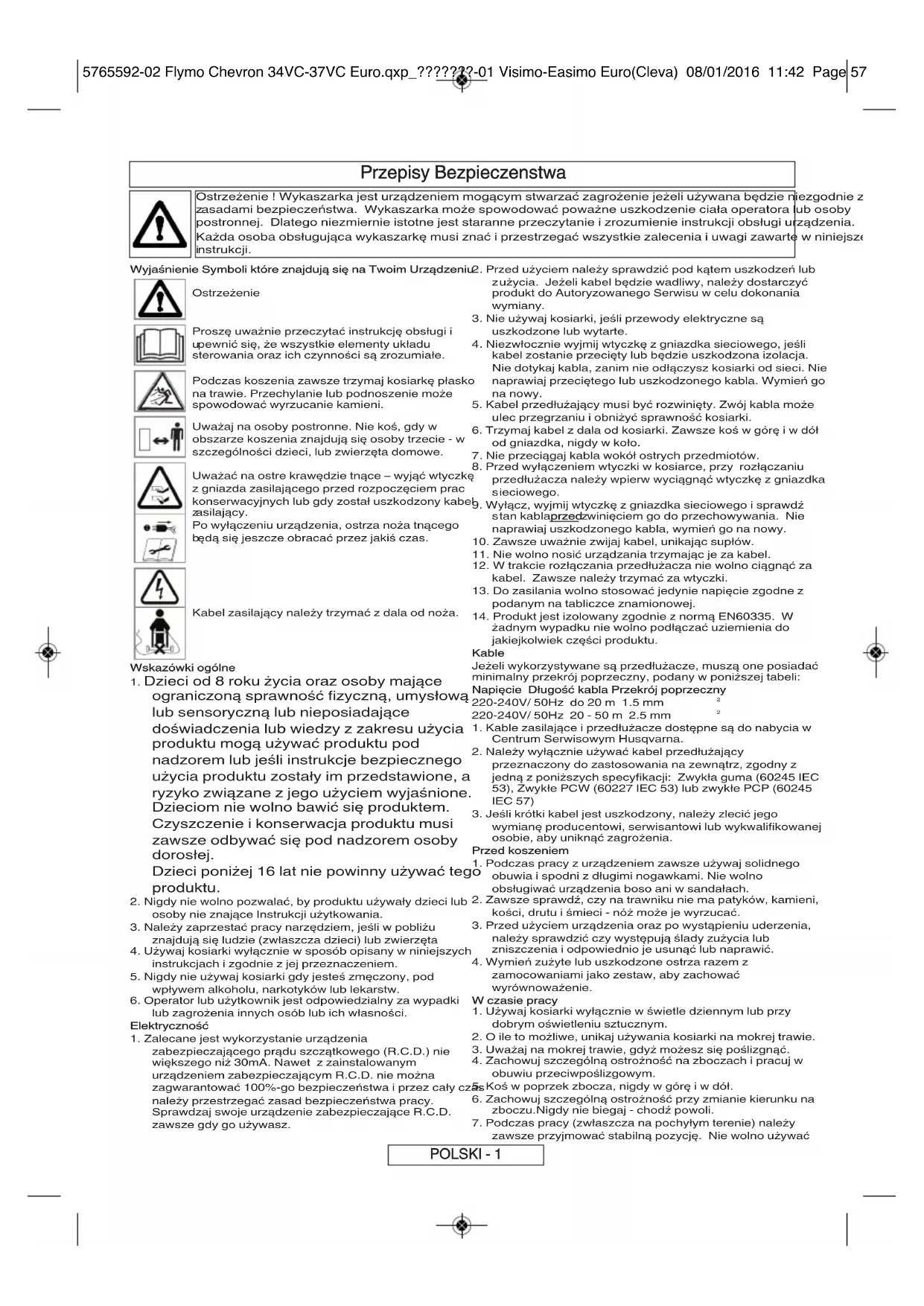 zawsze przyjmować stabilną pozycję. Nie wolno używać POLSKI - 1 5765592-02 Flymo Chevron 34VC-37VC Euro.qxp_???????-01 Visimo-Easimo Euro(Cleva) 08/01/2016 11:42 Page 57Uruchamianie i zatrzymywanie Uruchamianie kosiarki