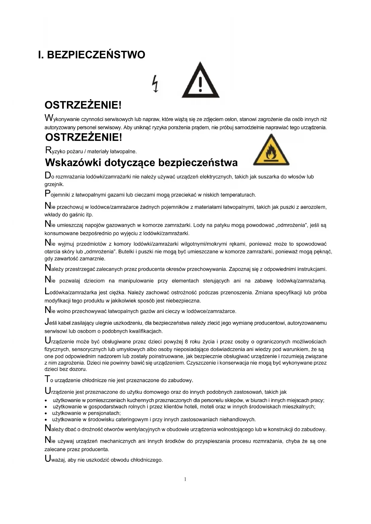 OSTRZEŻENIE! Wykonywanie czynności serwisowych lub napraw, które wiążą się ze zdjęciem osłon, stanowi zagrożenie dla osób innych niż autoryzowany personel serwisowy. Aby uniknąć ryzyka porażenia prądem, nie próbuj samodzielnie naprawiać tego urządzenia. OSTRZEŻENIE! Ryzyko pożaru / materiały łatwopalne. Wskazówki dotyczące bezpieczeństwa Do rozmrażania lodówki/zamrażarki nie należy używać urządzeń elektrycznych, takich jak suszarka do włosów lub grzejnik. Pojemniki z łatwopalnymi gazami lub cieczami mogą przeciekać w niskich temperaturach. Nie przechowuj w lodówce/zamrażarce żadnych pojemników z materiałami łatwopalnymi, takich jak puszki z aerozolem, wkłady do gaśnic itp. Nie umieszczaj napojów gazowanych w komorze zamrażarki. Lody na patyku mogą powodować „odmrożenia”, jeśli są konsumowane bezpośrednio po wyjęciu z lodówki/zamrażarki. Nie wyjmuj przedmiotów z komory lodówki/zamrażarki wilgotnymi/mokrymi rękami, ponieważ może to spowodować otarcia skóry lub „odmrożenia”. Butelki i puszki nie mogą być umieszczane w komorze zamrażarki, ponieważ mogą pęknąć, gdy zawartość zamarznie. Należy przestrzegać zalecanych przez producenta okresów przechowywania. Zapoznaj się z odpowiednimi instrukcjami. Nie pozwalaj dzieciom na manipulowanie przy elementach sterujących ani na zabawę lodówką/zamrażarką. Lodówka/zamrażarka jest ciężka. Należy zachować ostrożność podczas przenoszenia. Zmiana specyfikacji lub próba modyfikacji tego produktu w jakikolwiek sposób jest niebezpieczna. Nie wolno przechowywać łatwopalnych gazów ani cieczy w lodówce/zamrażarce. Jeśli kabel zasilający ulegnie uszkodzeniu, dla bezpieczeństwa należy zlecić jego wymianę producentowi, autoryzowanemu serwisowi lub osobom o podobnych kwalifikacjach. Urządzenie może być obsługiwane przez dzieci powyżej 8 roku życia i przez osoby o ograniczonych możliwościach fizycznych, sensorycznych lub umysłowych albo osoby nieposiadające doświadczenia ani wiedzy pod warunkiem, że są one pod odpowiednim nadzorem lub zostały poinstruowane, jak bezpiecznie obsługiwać urządzenie i rozumieją związane z nim zagrożenia. Dzieci nie powinny bawić się urządzeniem. Czyszczenie i konserwacja nie mogą być wykonywane przez dzieci bez dozoru. To urządzenie chłodnicze nie jest przeznaczone do zabudowy. Urządzenie jest przeznaczone do użytku domowego oraz do innych podobnych zastosowań, takich jak