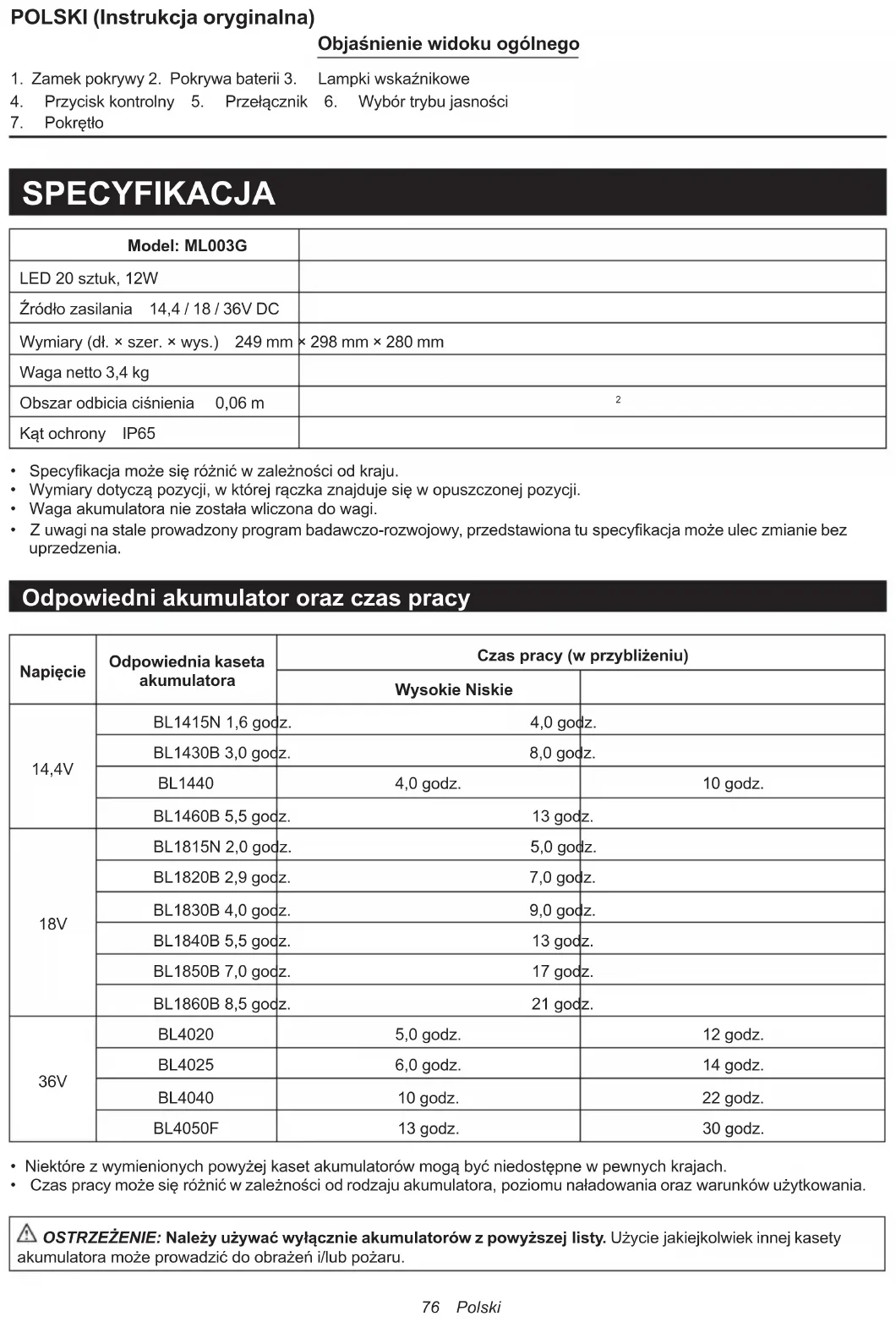 - Zuwaginastaleprowadzonyprogrambadawczo-rozwojowy,przedstawionatuspecykacjamożeuleczmianiebez uprzedzenia. Odpowiedni akumulator oraz czas pracy Napięcie Odpowiednia kaseta akumulatora Czas pracy (w przybliżeniu) Wysokie Niskie 14,4V BL1415N 1,6godz. 4,0godz. BL1430B 3,0godz. 8,0godz. BL1440 4,0godz. 10godz. BL1460B 5,5godz. 13godz. 18V BL1815N 2,0godz. 5,0godz. BL1820B 2,9godz. 7,0godz. BL1830B 4,0godz. 9,0godz. BL1840B 5,5godz. 13godz. BL1850B 7,0godz. 17godz. BL1860B 8,5godz. 21godz. 36V BL4020 5,0godz. 12godz. BL4025 6,0godz. 14godz. BL4040 10godz. 22godz. BL4050F 13godz. 30godz.