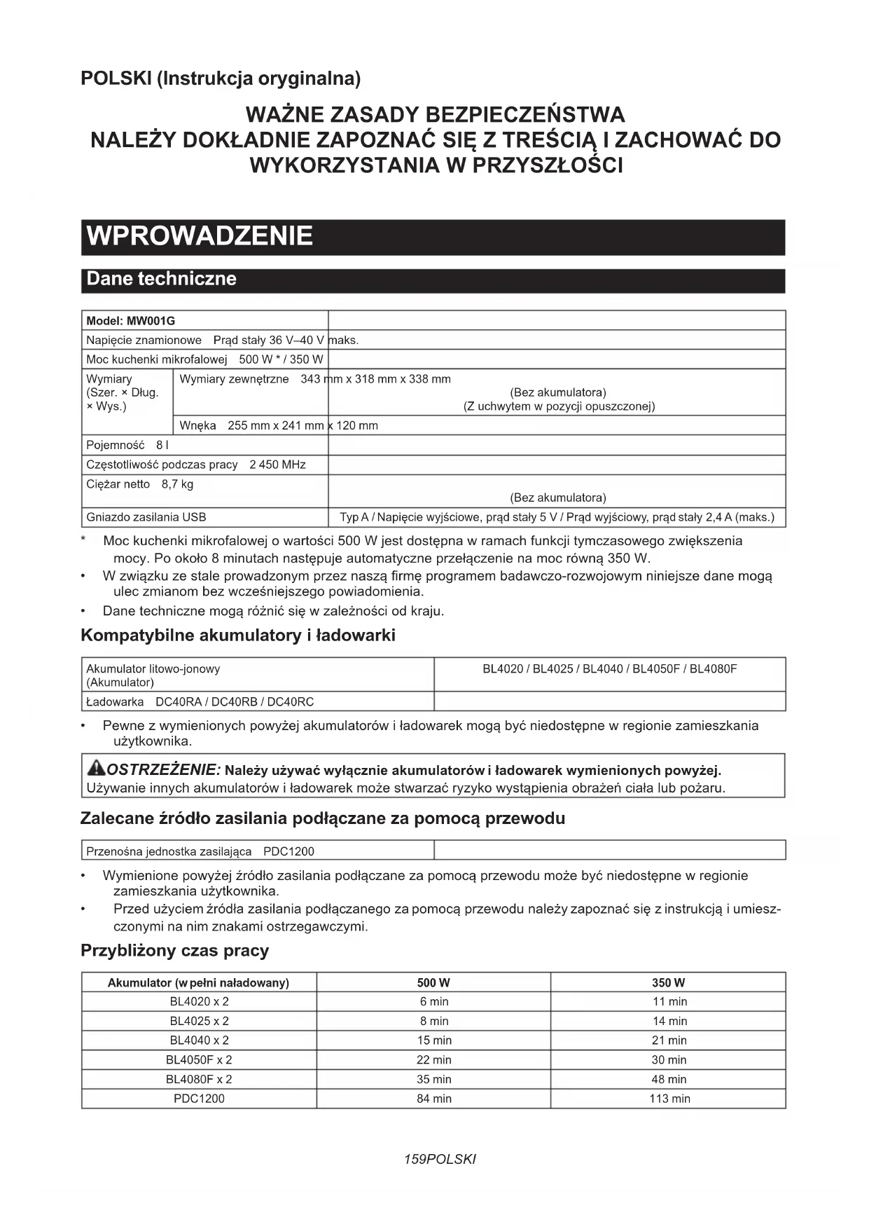 - Mockuchenkimikrofalowejowartości500Wjestdostępnawramachfunkcjitymczasowegozwiększeniamocy.Pookoło8minutachnastępujeautomatyczneprzełączenienamocrówną350W.• Wzwiązkuzestaleprowadzonymprzeznasząrmęprogramembadawczo-rozwojowymniniejszedanemogąuleczmianombezwcześniejszegopowiadomienia.• Danetechnicznemogąróżnićsięwzależnościodkraju. Kompatybilne akumulatory i ładowarki Akumulatorlitowo-jonowy(Akumulator)BL4020 / BL4025 / BL4040 / BL4050F / BL4080FŁadowarka DC40RA / DC40RB / DC40RC• Pewnezwymienionychpowyżejakumulatorówiładowarekmogąbyćniedostępnewregioniezamieszkaniaużytkownika. OSTRZEŻENIE: Należy używać wyłącznie akumulatorów i ładowarek wymienionych powyżej. Używanieinnychakumulatorówiładowarekmożestwarzaćryzykowystąpieniaobrażeńciałalubpożaru. Zalecane źródło zasilania podłączane za pomocą przewodu Przenośnajednostkazasilająca PDC1200• Wymienionepowyżejźródłozasilaniapodłączanezapomocąprzewodumożebyćniedostępnewregioniezamieszkaniaużytkownika.