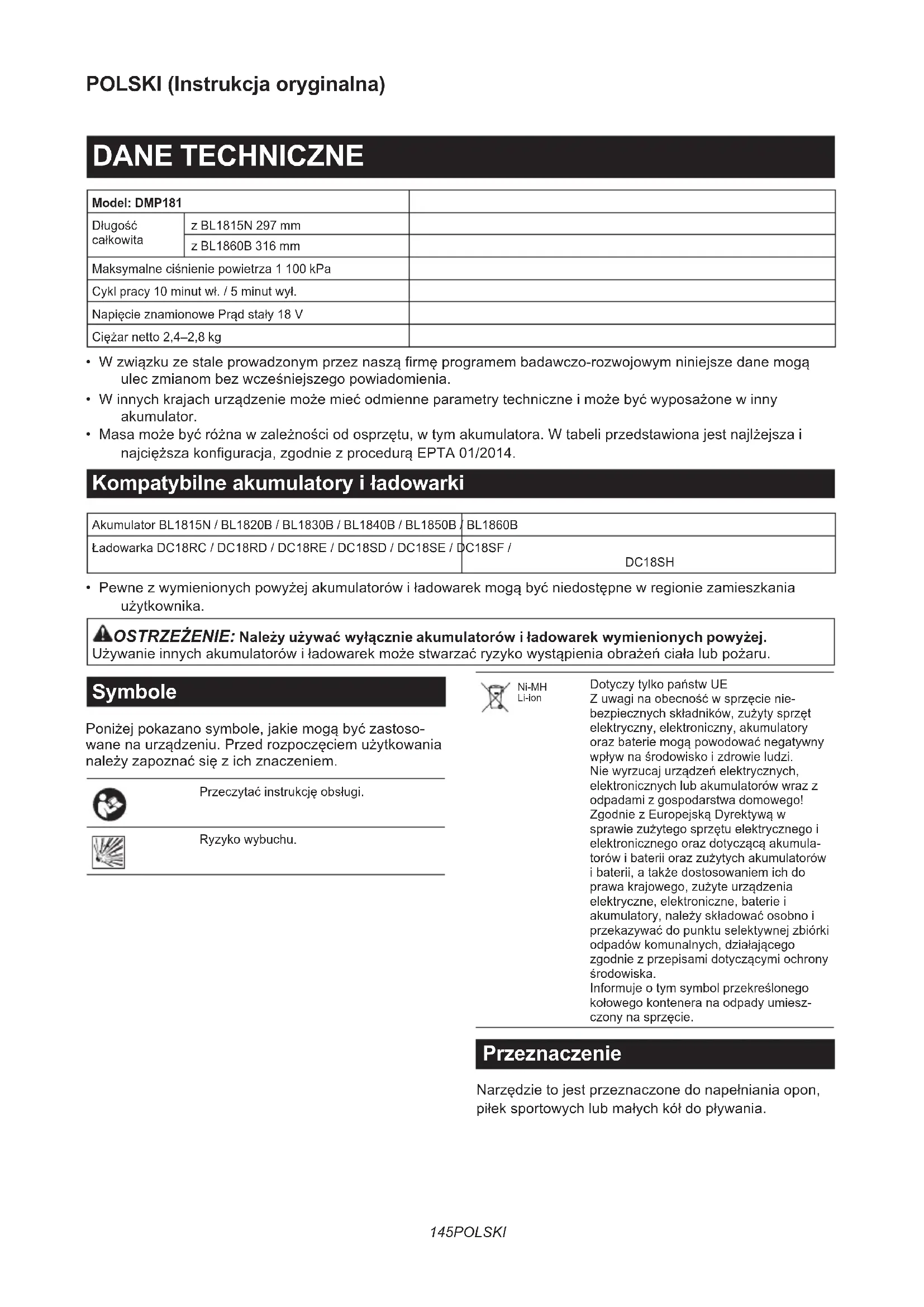 - Pewne z wymienionych powyżej akumulatorów i ładowarek mogą być niedostępne w regionie zamieszkania użytkownika. OSTRZEŻENIE: Należy używać wyłącznie akumulatorów i ładowarek wymienionych powyżej. Używanie innych akumulatorów i ładowarek może stwarzać ryzyko wystąpienia obrażeń ciała lub pożaru. Symbole Poniżej pokazano symbole, jakie mogą być zastoso- wane na urządzeniu. Przed rozpoczęciem użytkowania należy zapoznać się z ich znaczeniem. Przeczytać instrukcję obsługi. Ryzyko wybuchu. Ni-MH Li-ion Dotyczy tylko państw UE Z uwagi na obecność w sprzęcie nie- bezpiecznych składników, zużyty sprzęt elektryczny, elektroniczny, akumulatory oraz baterie mogą powodować negatywny wpływ na środowisko i zdrowie ludzi. Nie wyrzucaj urządzeń elektrycznych, elektronicznych lub akumulatorów wraz z odpadami z gospodarstwa domowego! Zgodnie z Europejską Dyrektywą w sprawie zużytego sprzętu elektrycznego i elektronicznego oraz dotyczącą akumula- torów i baterii oraz zużytych akumulatorów i baterii, a także dostosowaniem ich do prawa krajowego, zużyte urządzenia elektryczne, elektroniczne, baterie i akumulatory, należy składować osobno i przekazywać do punktu selektywnej zbiórki odpadów komunalnych, działającego zgodnie z przepisami dotyczącymi ochrony środowiska. Informuje o tym symbol przekreślonego kołowego kontenera na odpady umiesz- czony na sprzęcie. Przeznaczenie Narzędzie to jest przeznaczone do napełniania opon, piłek sportowych lub małych kół do pływania.146 POLSKI Hałas Typowy równoważny poziom dźwięku A określony w oparciu o normę EN62841-1: Poziom ciśnienia akustycznego (L